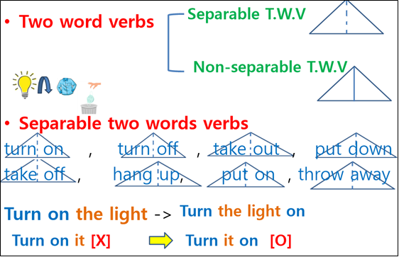 turn on(불을 켜다), turn off(불을 끄다), take out(꺼내다), put down(꺼내다), hang up(옷을 걸다/ 전화를 끊다), take off(옷을 벗다), put on(옷을 입다), throw away(버리다)…………..; They are separable two word verbs. 그것들은 분리 가능한 ‘two-word verbs’ 다.