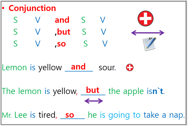 We use conjunctions to connect two words or two sentences. 우리는 두 단어나 두 문장을 연결하기 위해 접속사를 쓴다.