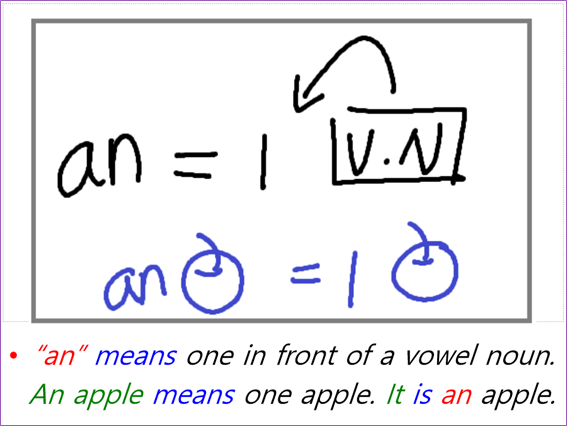 의 차이를 쉽게 이해할 수 있다. ‘an’은 모음 단어로 시작하는 단어 앞에서 ‘하나’라는 뜻을 내포하고 있다.