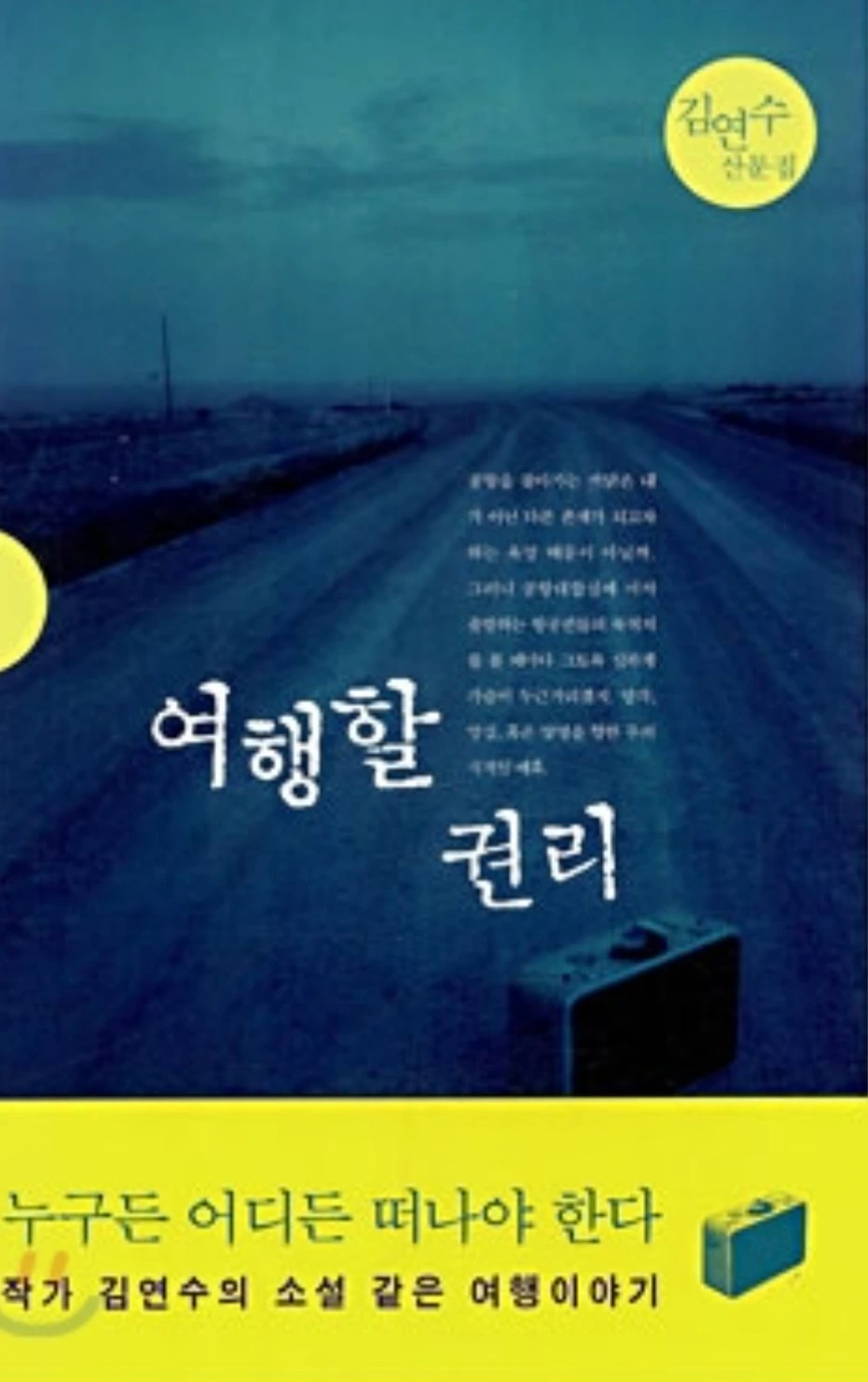 '여행할 권리'라는 책 제목은 '살 권리'라는 말과 잘 어울린다. 책 상단 부분에 간간이 보여주는 옛 우표 크기보다 조금 큰 작은 여행지의 사진이 책의 중심이 여행지가 아님을 보여 준다. 책의 두쪽 사이에 끼여있는 노란 작은 원은 삶의 중심을 잃지 말라는 또 다른 표현인지 모른다.