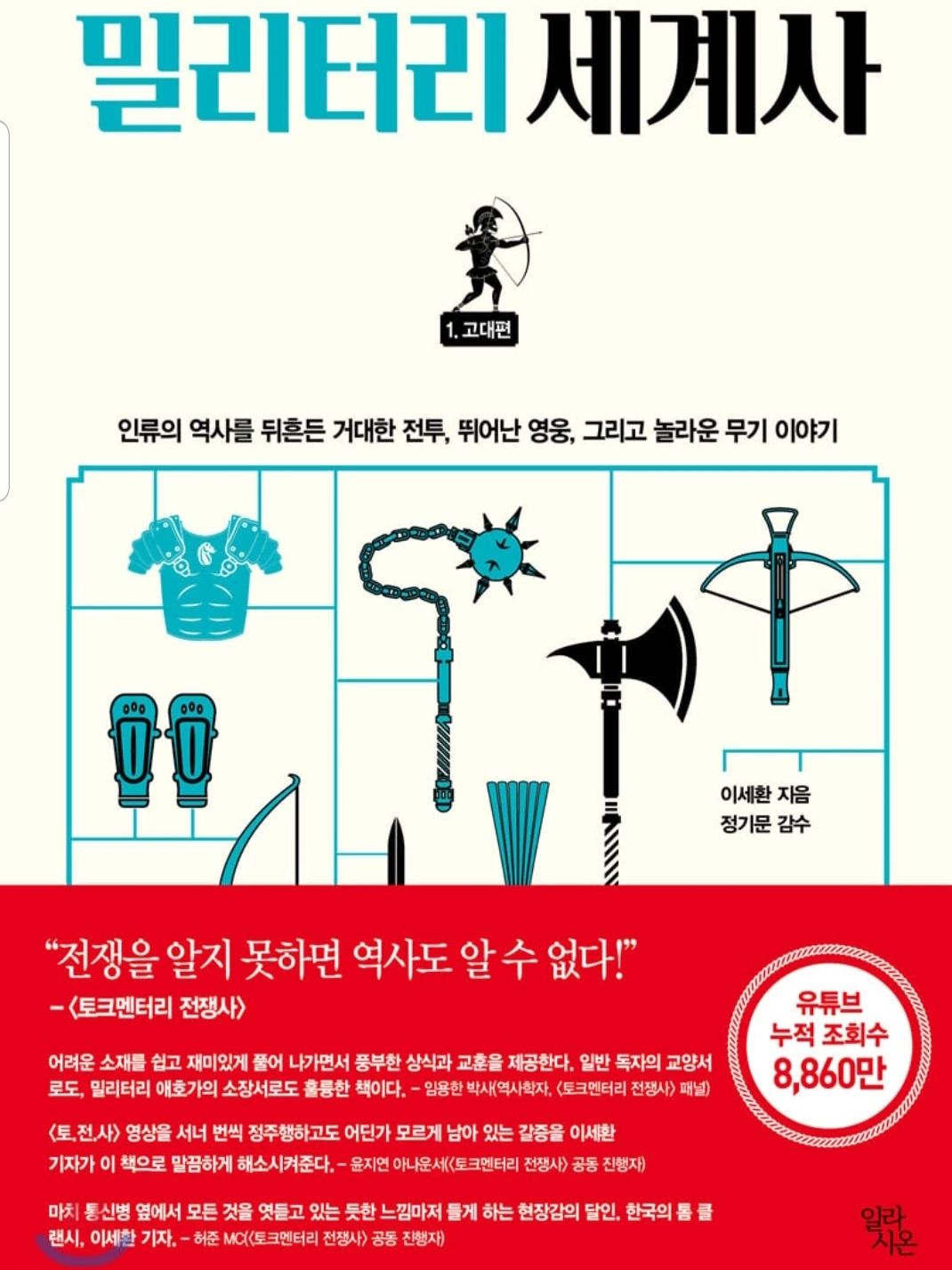 역사를 이해하고 공부하는 것은 눈이 쌓이는 원리와 같다. 어렵지만 꾸준하게 조금씩 읽다 보면 첫눈은 지면에 녹아 사라져 버리지만 지속적으로 눈 내리듯 공부한다면 어느 순간 눈의 세계를 만날 수 있을 것이다. 밀리터리 콘텐츠 전문가라는 다소 이색적인 일을 하는 저자 이세환 기자의 안목은 선명하다. 무기를 보면 전쟁이 보이고 전쟁이 보이면 역사가 보인다는 생각으로 무기의 역사와 전쟁 그리고 인물 중심의 이야기는 흥미롭다. 기존에 단편적으로 알고 있던 세계사 지식이 조금 연결되는 느낌이 있고, 내가 알고 있던 정보와 다소 상치되는 부분도 있다. 책은 그리스-페르시아 전쟁, 살 라버스 해전, 펠로폰네소스 전쟁, 알렉 산드로 스 대왕의 정복전쟁, 진시황의 통일, 한무제의 흉노 정벌, 포에니 전쟁, 로마 전쟁과 팍스 로마나, 위-촉-오 삼국 전쟁, 고구려 -수나라, 고구려- 당나라 전쟁사를 이야기한다. 그 중심에 각 나라에서 썼던 무기들에 대한 상세한 그림과 설명이 독특하다. 책은 한 번씩 들어본 전쟁사들의 역사적 배경과 원인 그리고 시대상을 선물한다.