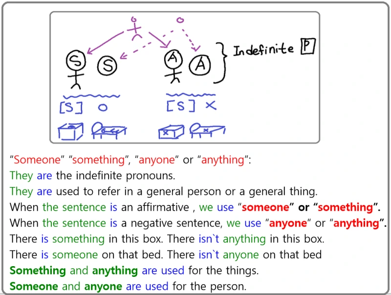 “someone” “something”, “anyone “ or “anything”: They are the indefinite pronouns. “someone” “something”, “anyone “ 또는 “anything”을 부정 대명사라고 부른다.