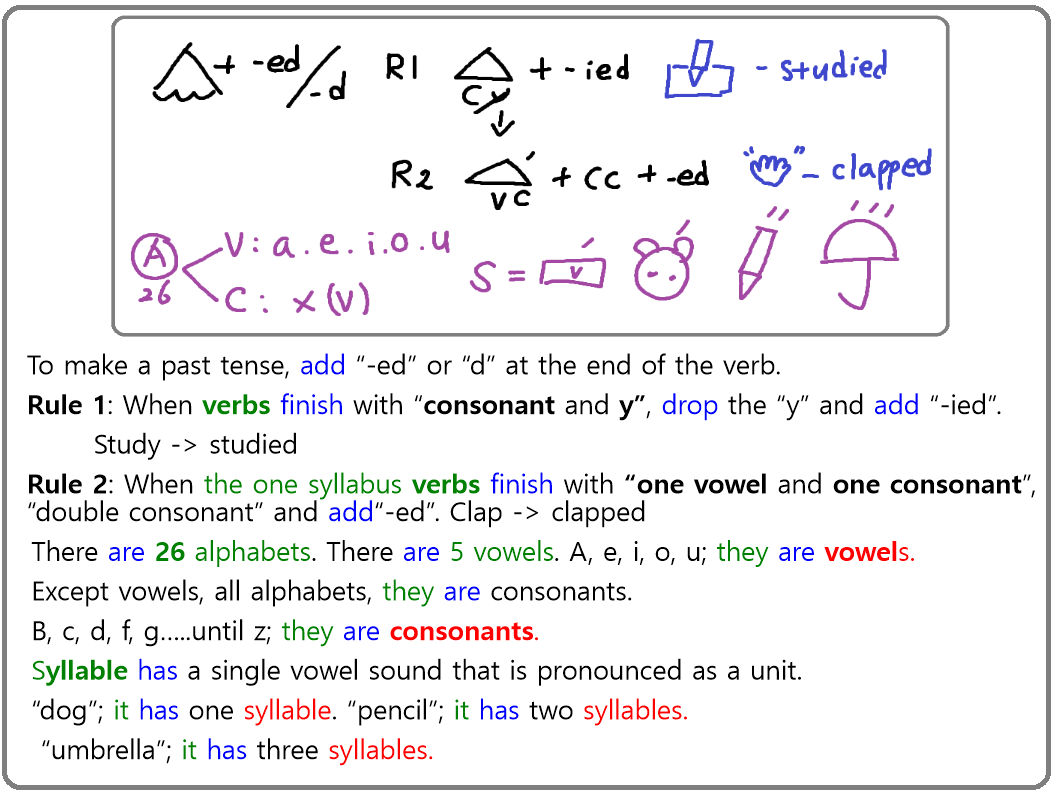 과거형의 규칙을 이해하고 말하기 위해서는 다양한 영어적 확장 지식이 필요하다. 모음, 자음, 개념과 같은 사소해 보이는 규칙들을 명확히 이해해야 언어의 규칙의 변 와와 불규칙들을 더 쉽게 이해할 수 있다. 과거 시제 규칙 동사 만드는 법을 이해했다면 다음과 같이 말할 수 있어야 한다.