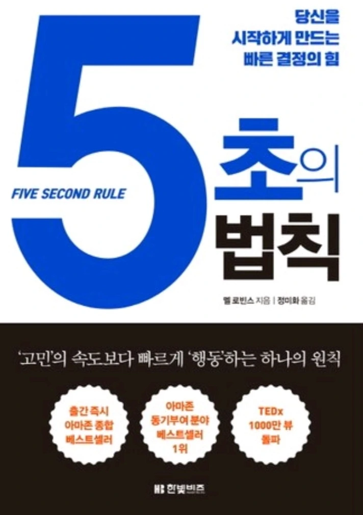 어느 날 잠들기 전 로켓 발사 장면을 보던 그녀는 매일 아침 조금 더 자기 위해 알람 버튼을 누르는 대신 ‘5,4,3,2,1’이라는 마음의 구호를 외치고 뇌에게 생각할 시간을 주지 않고 바로 몸을 일으키는 일상을 만들어 냈다. 숫자를 5부터 1까지 거꾸로 세는 일은 전전두엽 피질을 자극할 뿐 아니라 변화에 필요한 강력한 초기 에너지를 만드는 준비 과정이 된다고 한다. 5초의 법칙은 내면의 힘을 이용해 인생을 바꾸는 가장 쉬운 방법이 되었다고 한다. ‘자신의 삶을 바꿔줄 한 사람을 찾고 있다면 거울을 보라.’ 인상 깊은 문구다. 아침마다 쫓기던 삶으로 몰아쳐지던 일상을 주도성 있는 시작을 만들어 하루라는 일정을 서랍장 옷정리 하듯이 잘 정리하기 시작했다. 결국, 일상을 관리하는 법을 깨닫게 되었고, 5초 법칙을 테드 강연에서 소개하여 많은 이들의 공감을 얻게 되었다. 책은 그녀가 소개한 5초 법칙을 삶에 적용한 사람들의 변화된 자신들의 일상과 일도 함께 소개하고 있다.