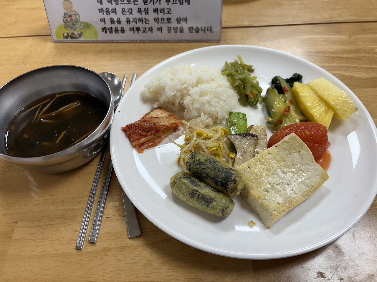 6시가 되어 저녁 공양을 했다. 밥이 너무 맛있어서 하루 종일 아무것도 먹지 않은 사람처럼 먹었다. 하얀 쌀밥에 두부, 청경채, 콩나물 등 건강한 음식이 가득했다. 이게 바로 저속노화 식단 아닐까. 특히 청경채. 아삭한 청경채에 칠리소스가 뿌려지니 예상치 못한 달콤함과 매콤함에 기분이 좋아졌다. 건강한 밥상으로 이렇게 행복을 느낄 수 있구나. 집에 돌아가면 이렇게 먹어야지.