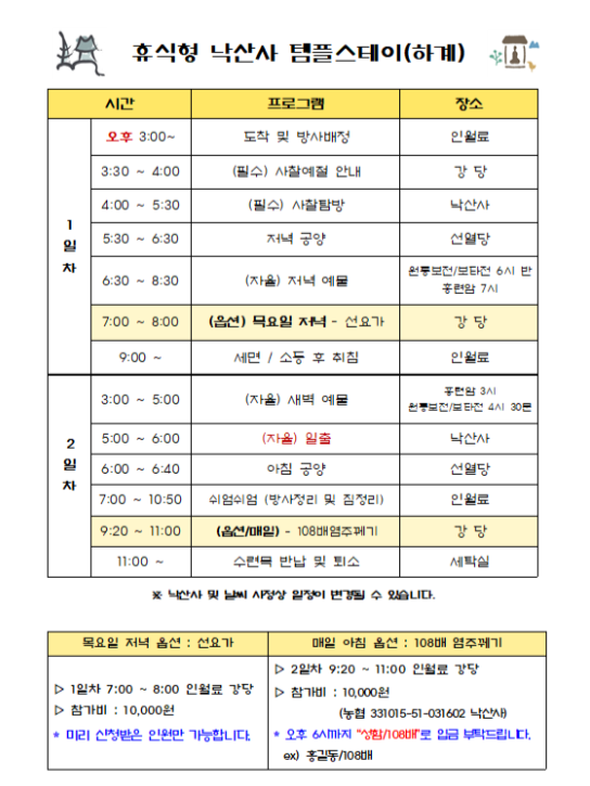 강당으로 가서 템플스테이 일정표를 받았다. 일정이 알차서 기대가 됐다. 사찰 예절 안내를 받으며 템플스테이의 기본예절과 스님 말씀을 들었다.
