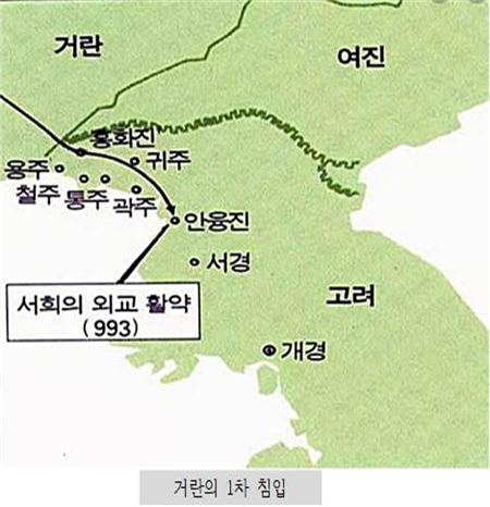 성종12년 (10월) 거란이 고려를 쳐들어왔다. (소손녕이)서희에게 말하였다. “너희 나라는 신라 땅에서 일어났다. 고구려는 우리의 소유인데 너희 나라가 이를 침식하고 있다. 또 우리와 국경을 맞대고 있음에도 바다를 건너 송을 섬기고 있다.