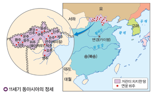 거란(요)은 926년 발해를 멸망시키고 만리장성을 넘어 연운 16주를 차지하였다.