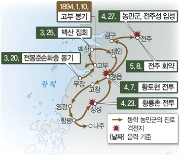 동학농민군은 황토현 전투(4. 7.)와 황룡촌 전투(4. 23.)에서 정부군을 격파한 후 4월 27일 전주성을 점령한다. 5월 8일 동학 농민군은 폐정개혁안을 수용한 정부와 전주화약을 체결하였다.