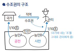수조권은 ‘조(토지세)를 걷는 권리’로 원칙적 소유권을 가진 왕이 수조권도 가지고 있다.