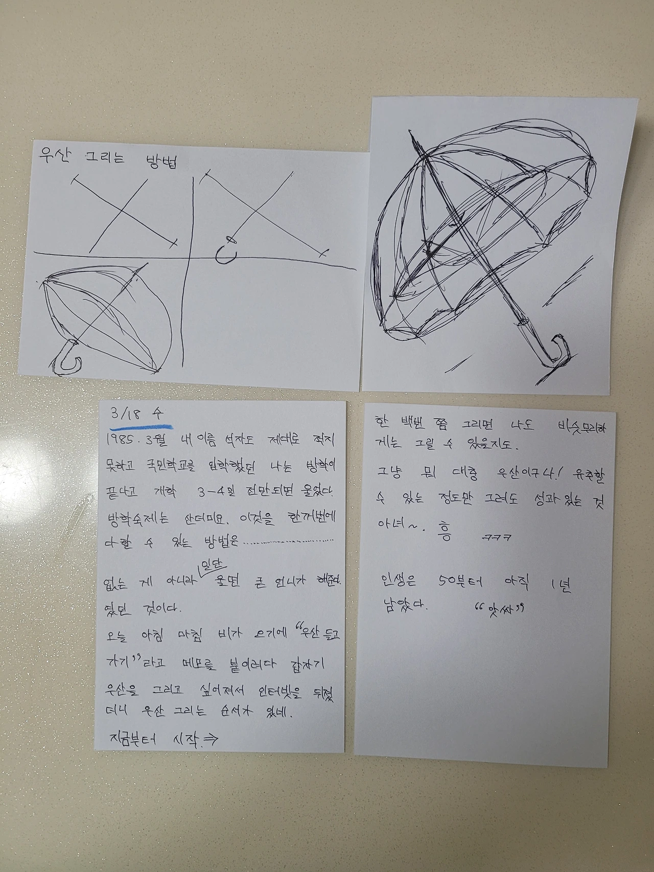오늘 아침 마침 비가 오기에 "우산 들고 가기"라고 메모를 붙이려다 갑자기 우산을 그리고 싶어 져서 인터넷을 뒤졌더니 우산 그리는 순서가 있네.