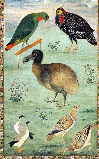 인도의 궁정 예술가이자 박물학자였던 우스타르 만수르(Ustad Mansur,?~1624)의 1625년경 그림이다. 영국의 여행 작가였던 Peter Mundy (1596~1667)에 의하면 1600년대에 도도새 두 마리가 인도에 반입되었다고 한다. 이 그림은 무굴 제국의 동물원에서 살아있던 도도새를 보고 그린 것으로 추정되며 정확하게 묘사된 몇 안 되는 색채 그림이다.