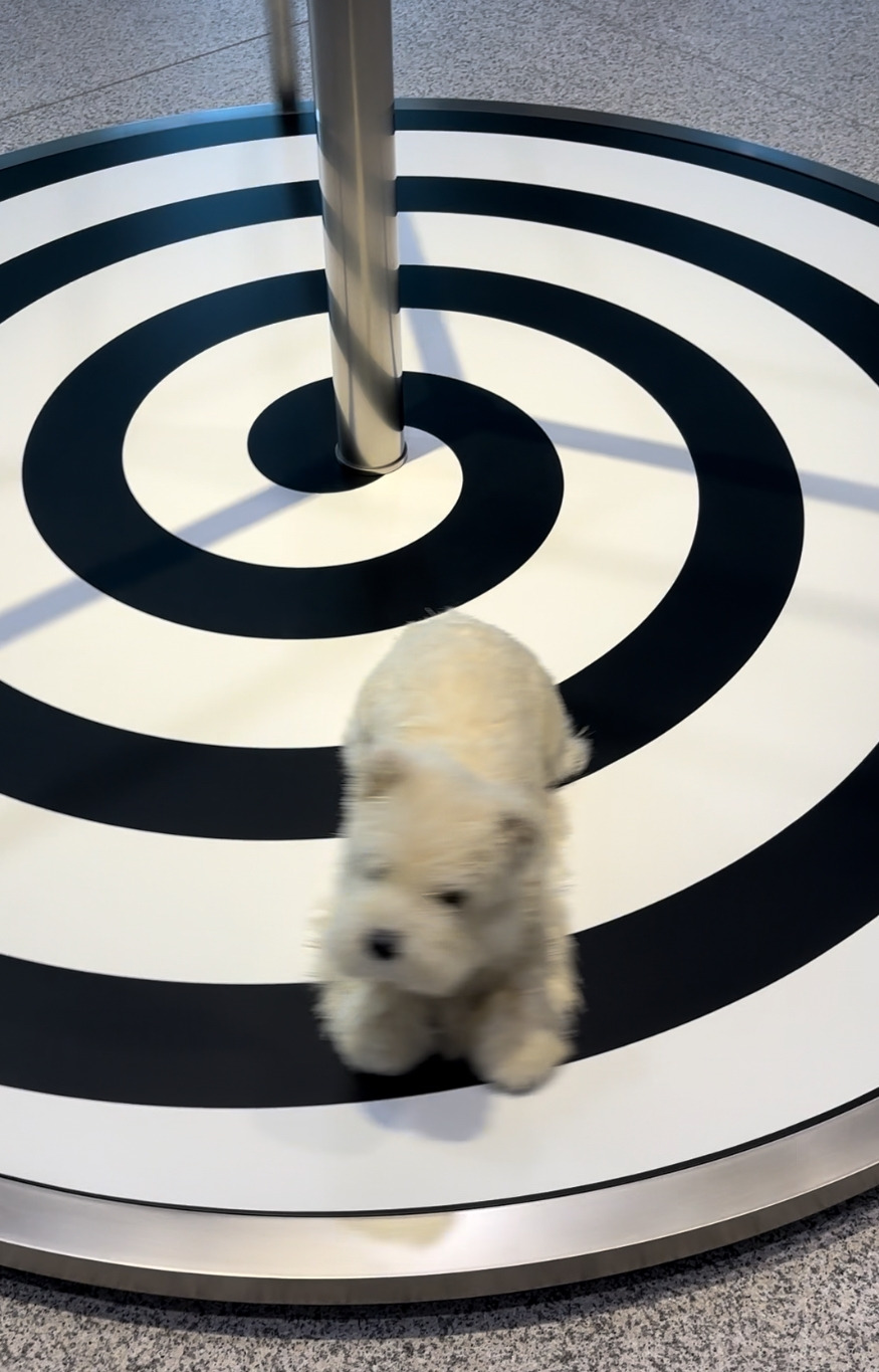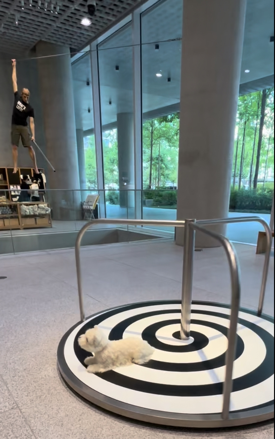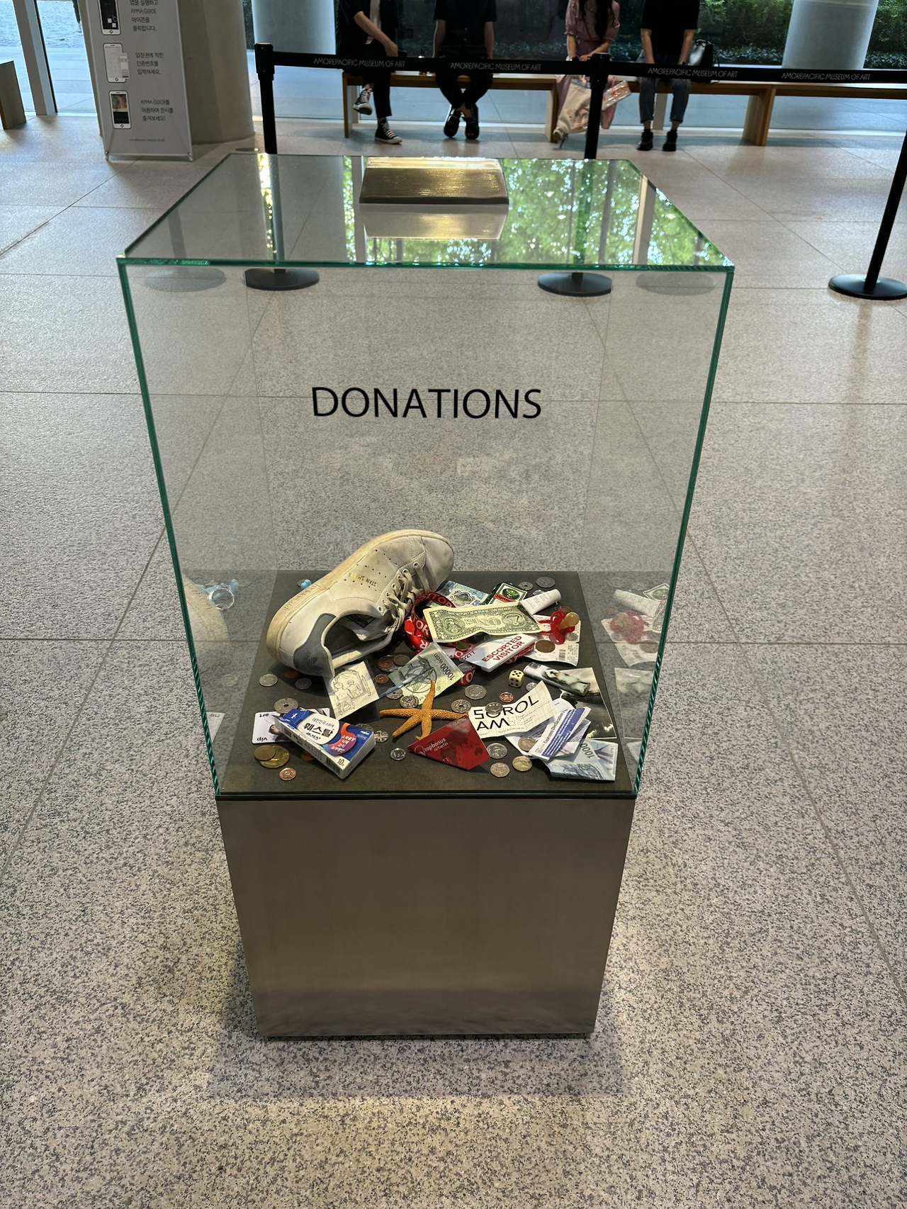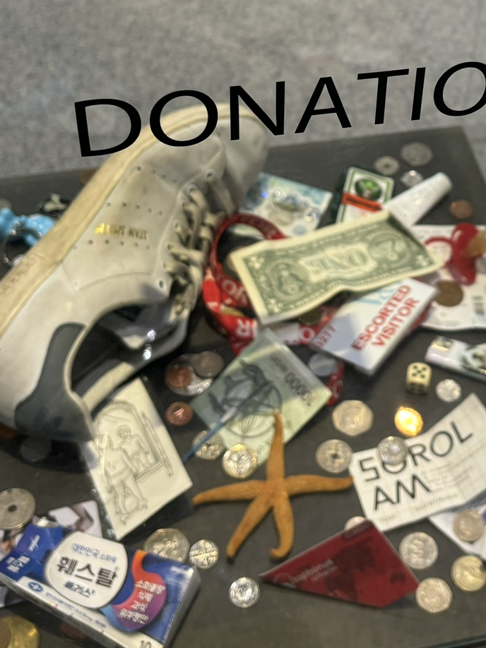 1층에서 몇 가지 작품을 만날 수 있다. 빙글빙글 돌고 있는 테리어 <Soviat Media Terrier, 2022>, 헌신짝등 쓰레기가 들어있는 모금함 <Donation Box, 2006>, 계단 위에서 두 봉을 붙잡고 허공에 떠 있는 남자 <What’s Left?, 2021> 모두 전시에 대한 신비감을 높여준다. 계단을 따라 지하로 내려간다.