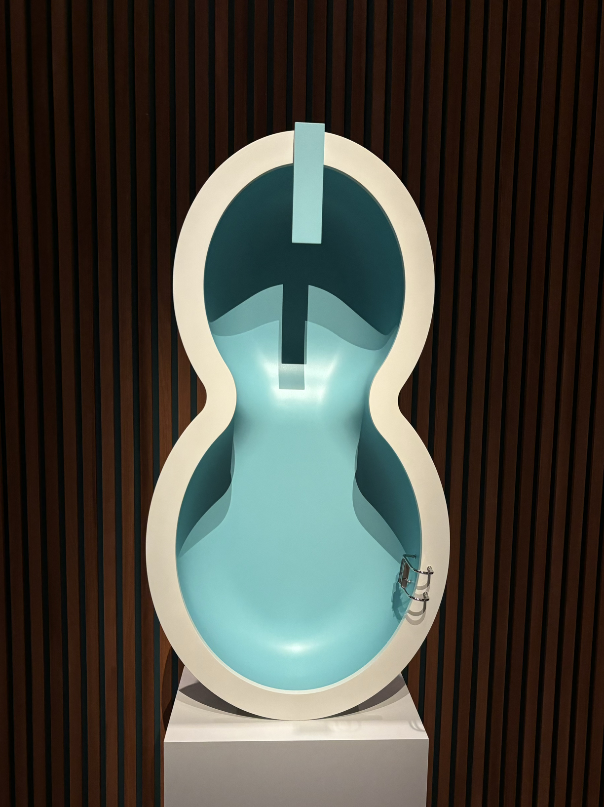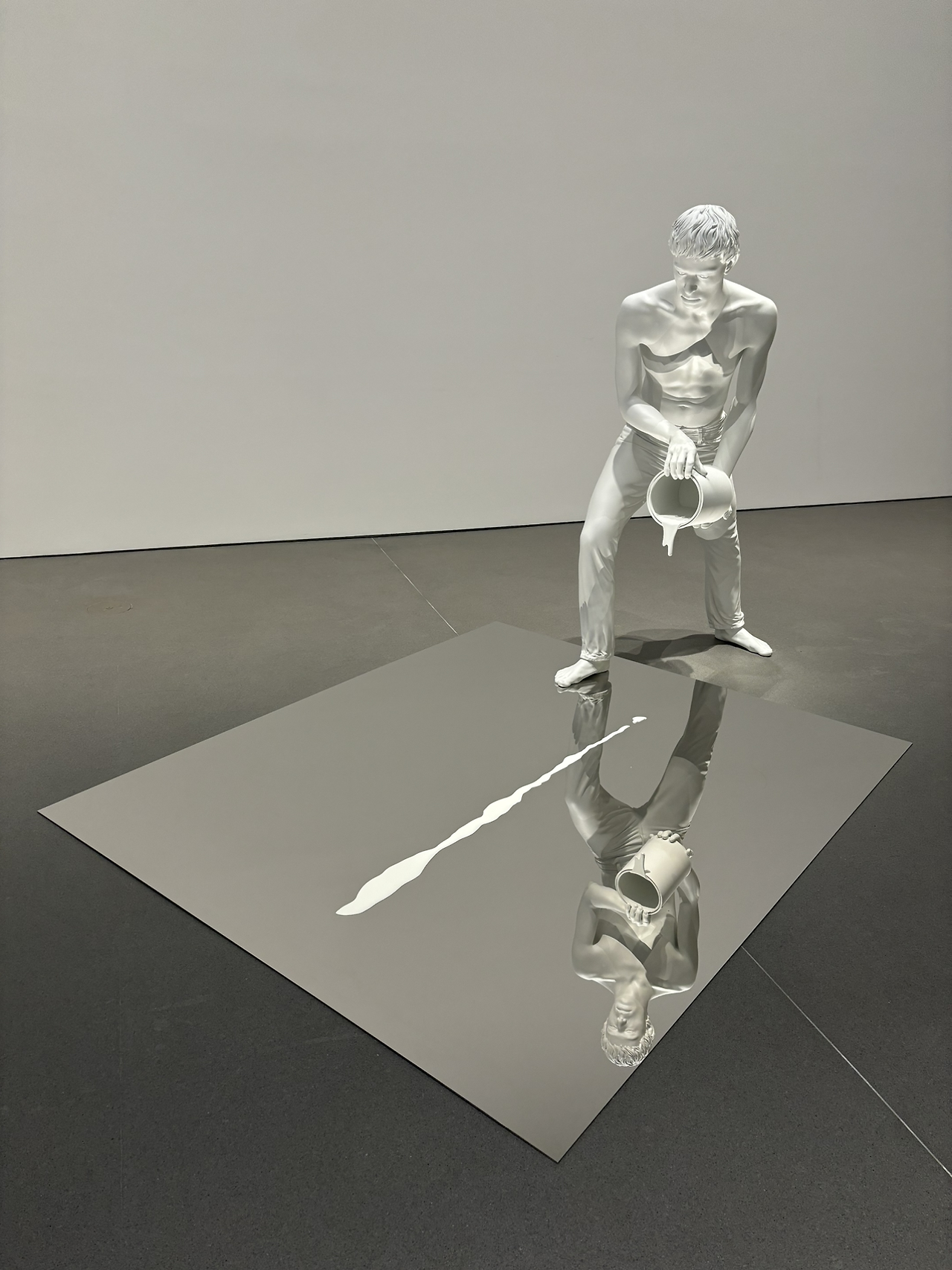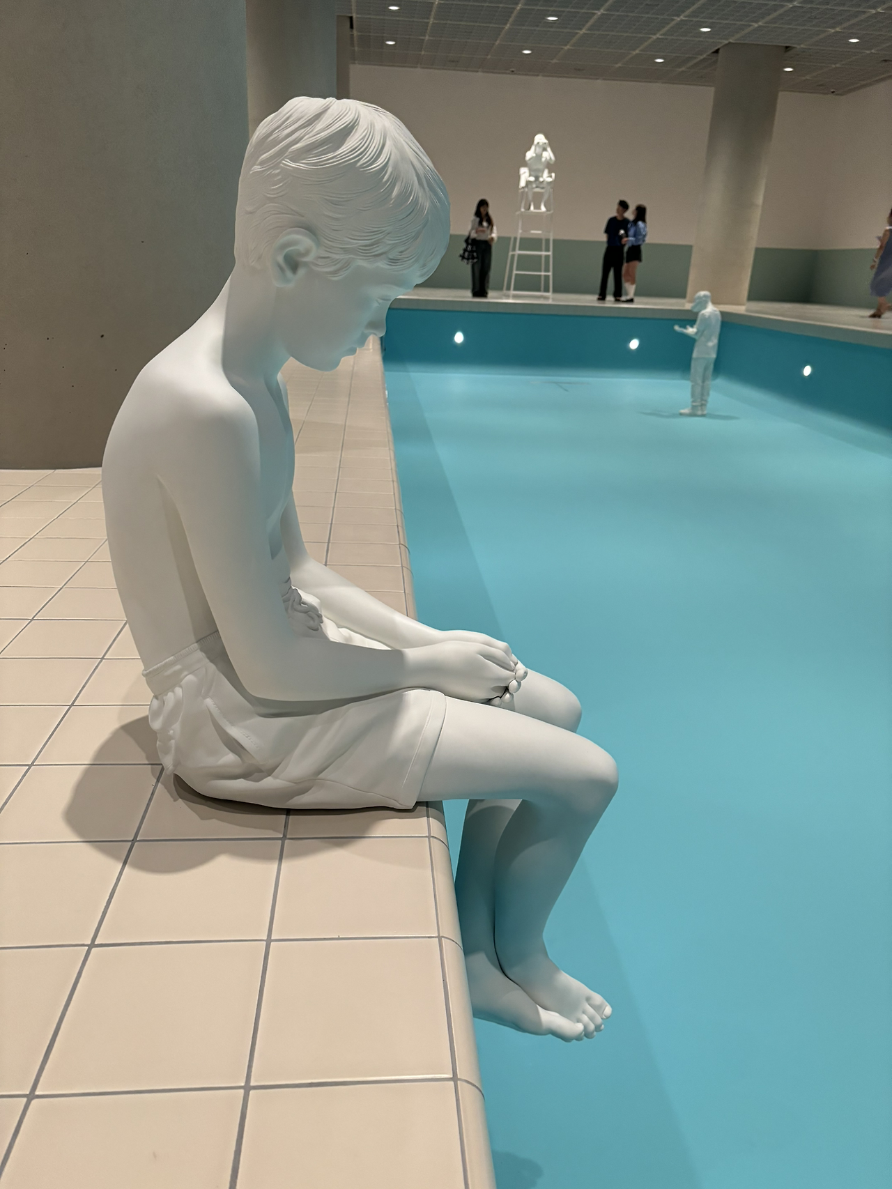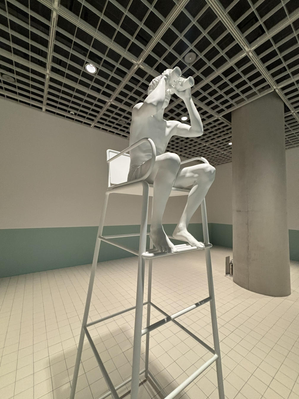 그 옆 전시실로 가면 물이 없는 빈 수영장이 있다. 수영장 벽에 걸려있는 구명조끼까지도 작품이다. 수영장 벽에 작은 구멍이 나있다. 그 구멍을 통해서 들여다볼 수 있는데 그것도 작품이다. 수영장에 걸터앉아 있는 아이, 수영장 속에 있는 아이, 라이프가드 자리에 앉아있는 아이가 각각의 자리에 위치해 있다. 그리고 아모레퍼시픽의 소장품인 <The Screen, 2021> 작품이 있다. 작품설명에 의하면, 수영장에 대해서 이렇게 해설하고 있다. 꽤 어렵다. 무슨 말인지 모르겠지만. 물이 빠진 수영장은 오늘날 공공장소의 쇠퇴와 공동체의 상실을 암시한다. 수영장을 무대로는 고전 작품을 연상시키는 백색의 조각들이 등장하여 현대의 남성성과 고립 및 성장에 관한 실존적 질문들을 던진다…. 설명이 너무나 어렵다. 아 어려운 현대미술이다.