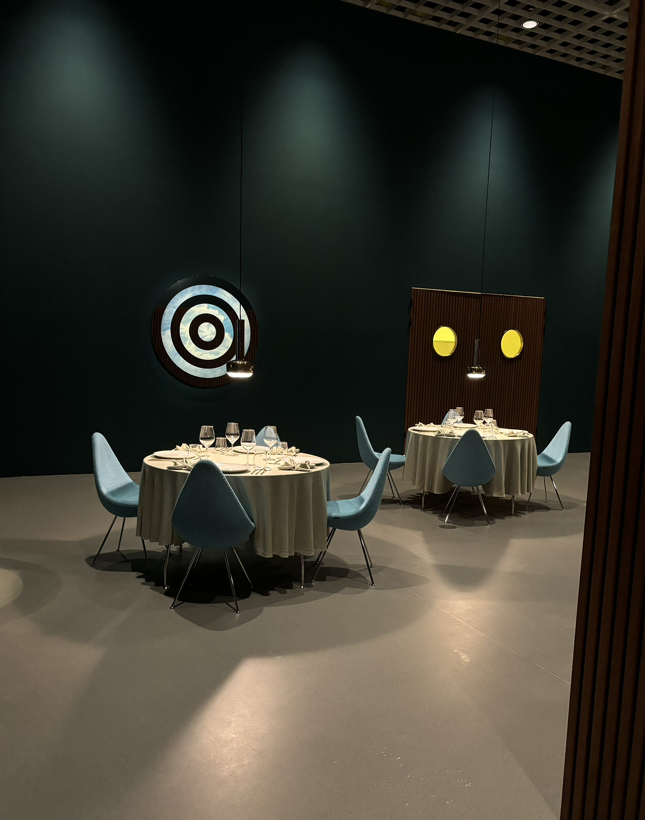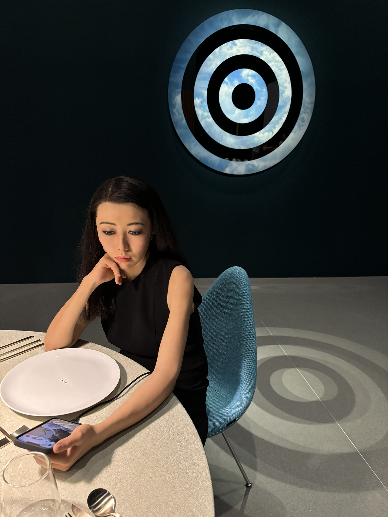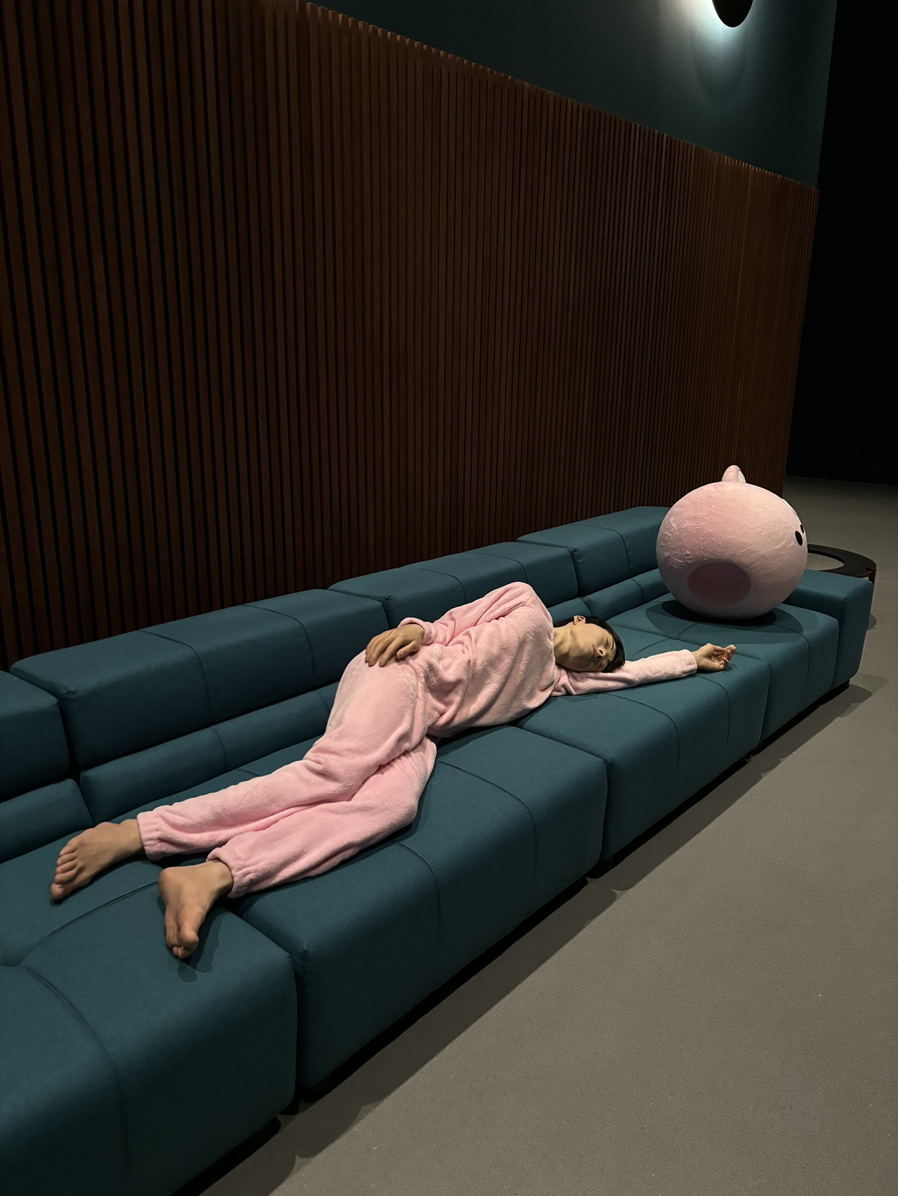 다음 방으로 넘어가면 근사한 레스토랑이 있다. 창문의 위치에는 <교토의 하늘, 2024> <상해의 하늘, 2024> <부산의 하늘, 2024> 작품이 창문처럼 걸려서 바깥세상과 소통하고 있고, 테이블에 앉아 있는 여자는 손 안의 핸드폰 속의 누군가와 대화를 하고 있다. <The Conversation, 2024> 왠지 한심해 보이는 모습이다. 우리의 모습 같다. 앉기만 하면 뭔가를 들여다보고 있는 듯한 모습… 그곳의 공간과는 상관없이 손안에 빠져들어가 있는 모습을 보여주는 듯하다. 소파에 멋지게 차려입고 <All dressed up, 2022> 뻗어있는 누군가의 모습도 내 모습같다 ㅎㅎ
