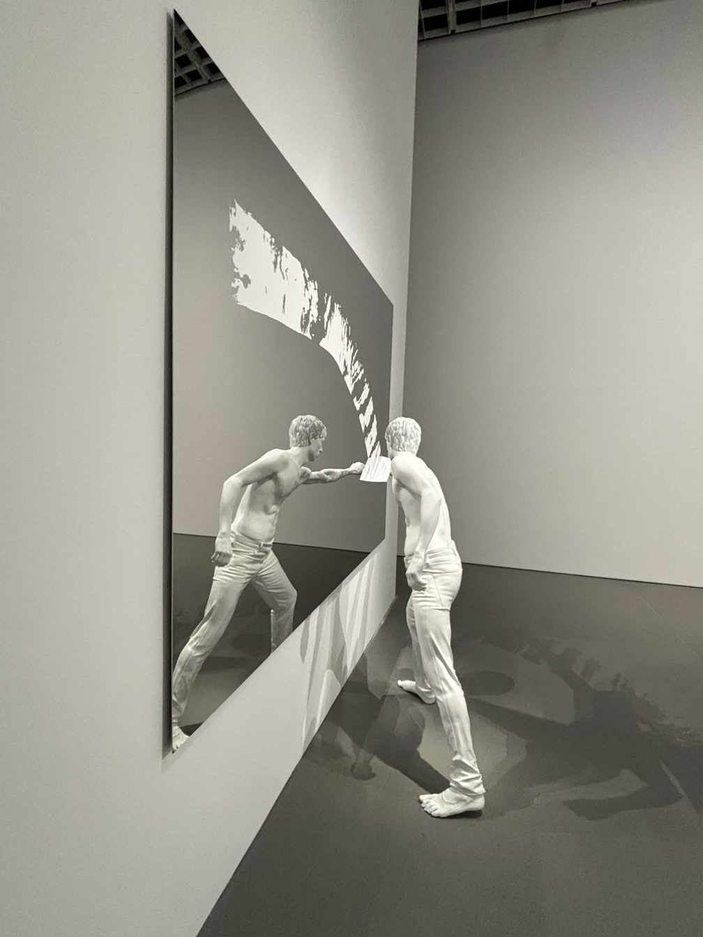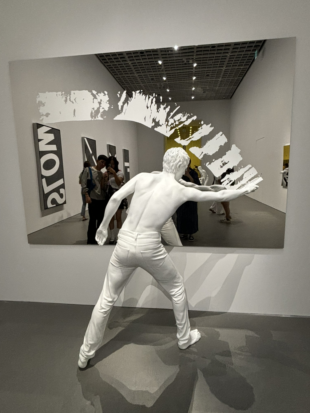 그다음 방은 작가의 아뜰리에임을 알 수 있다. 작가들이 작업하는 모습은 거울에 반사되기도 하고, 캔버스 자체가 거울로 되어 있기도 하다. 거울을 통해서 우리의 모습과 작가의 모습과 전시장의 모습이 한데 어우러진다. 작가의 기획 의도는 이 경계를 무너뜨리는 거라고 했다.