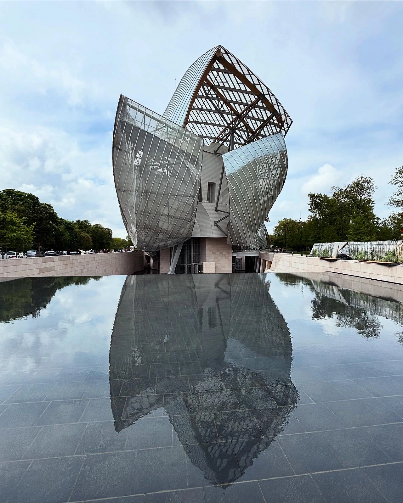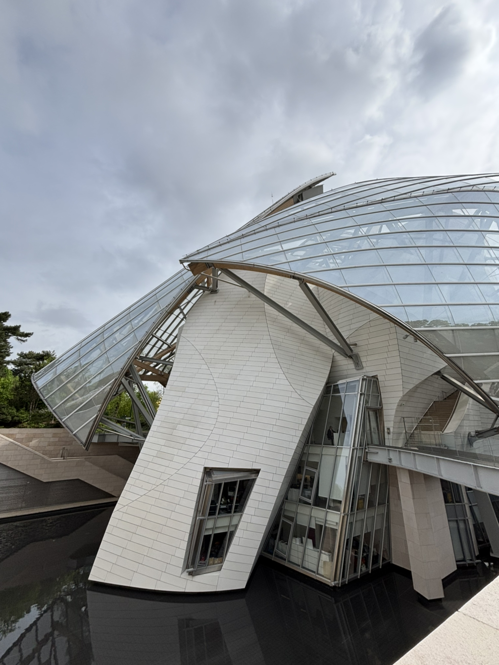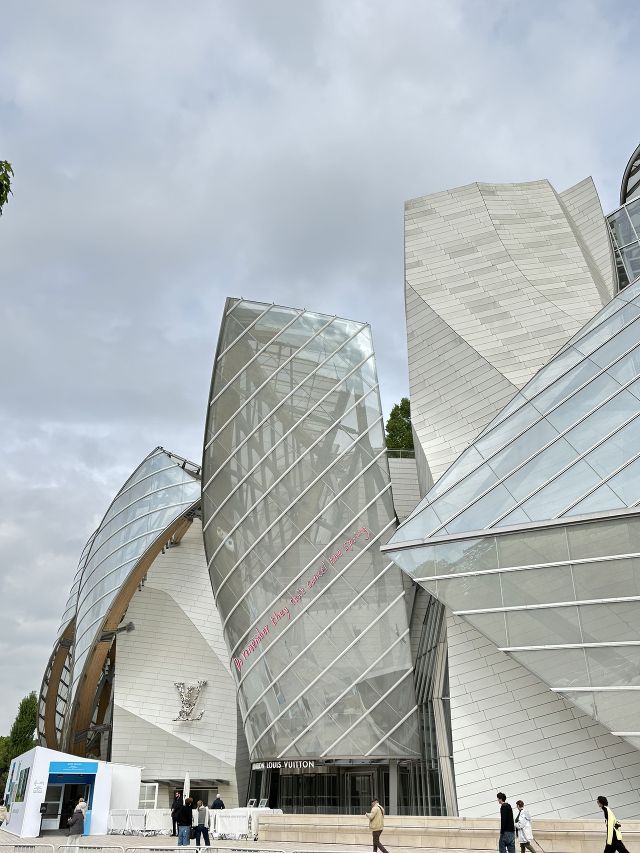 프랭크 게리는 파리의 그랑 팔레와 아클리마타시옹 정원 안에 1893년에 지어진 유리 온실 (Palmarium)에서 영감을 받아 건물을 구상했습니다. 공원에서 벗어나면서 범선의 돛 모양을 하고 있는 유리건물을 마주하게 됩니다. 은빛 루이뷔통 로고도 보이네요.