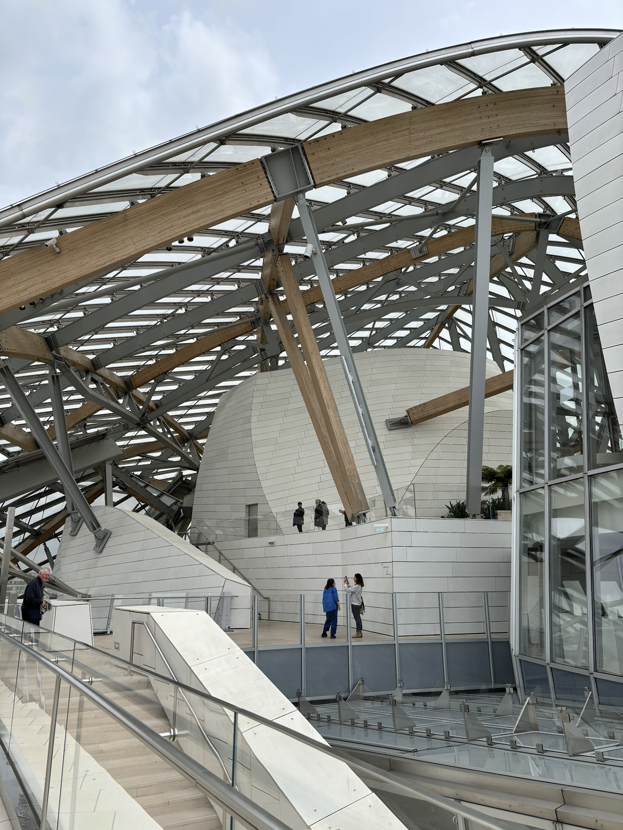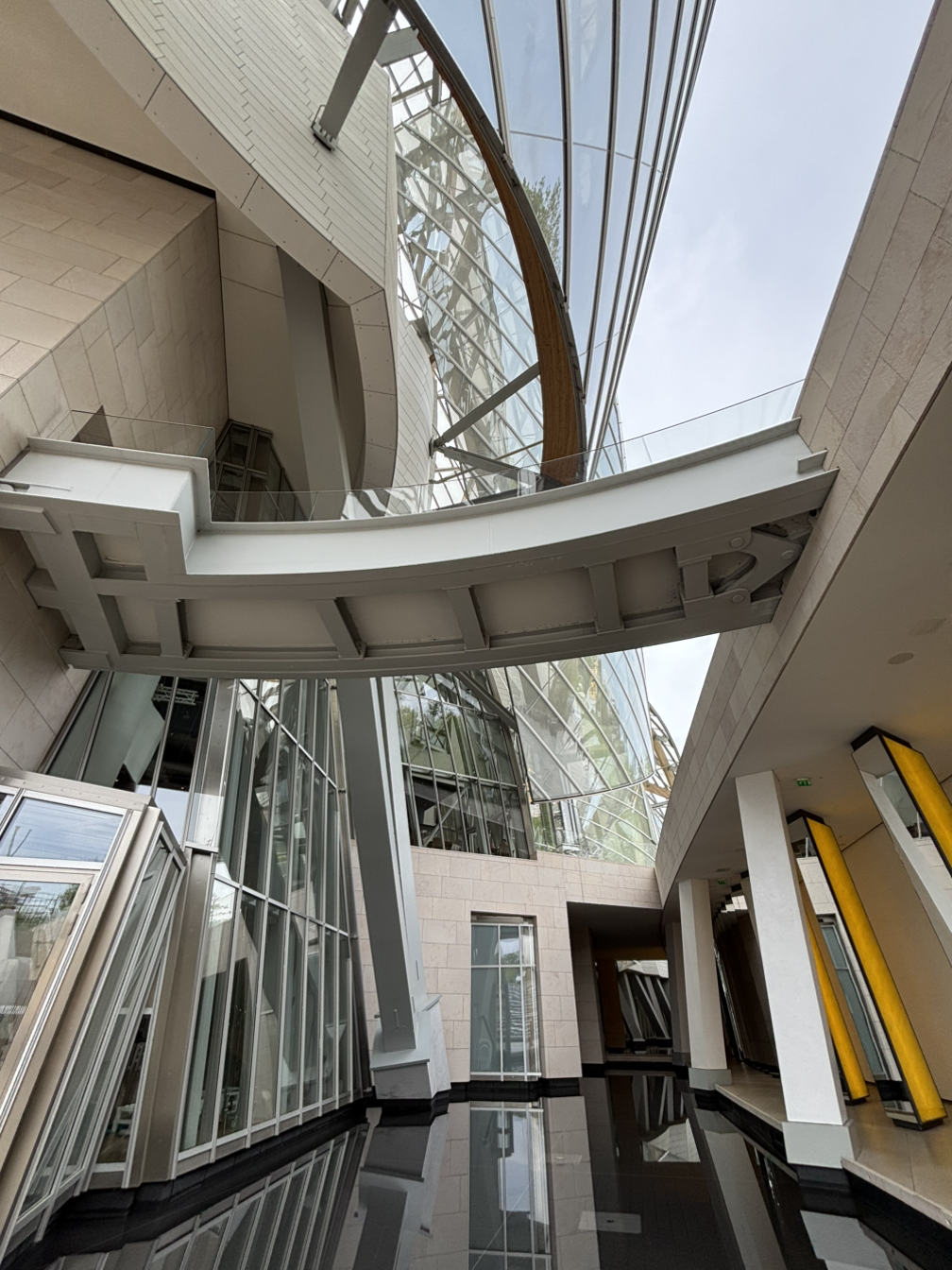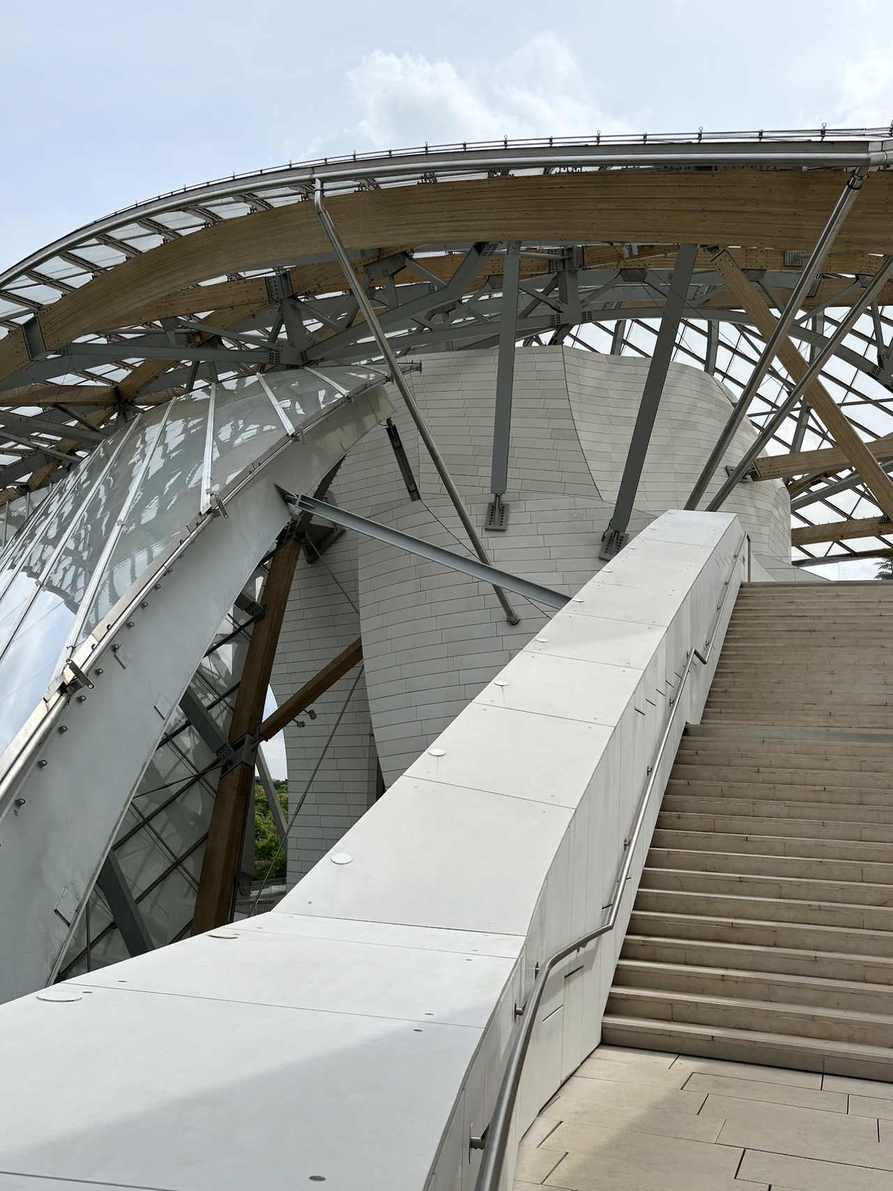 프랭크 게리는 파리의 그랑 팔레와 아클리마타시옹 정원 안에 1893년에 지어진 유리 온실 (Palmarium)에서 영감을 받아 건물을 구상했습니다. 공원에서 벗어나면서 범선의 돛 모양을 하고 있는 유리건물을 마주하게 됩니다. 은빛 루이뷔통 로고도 보이네요.