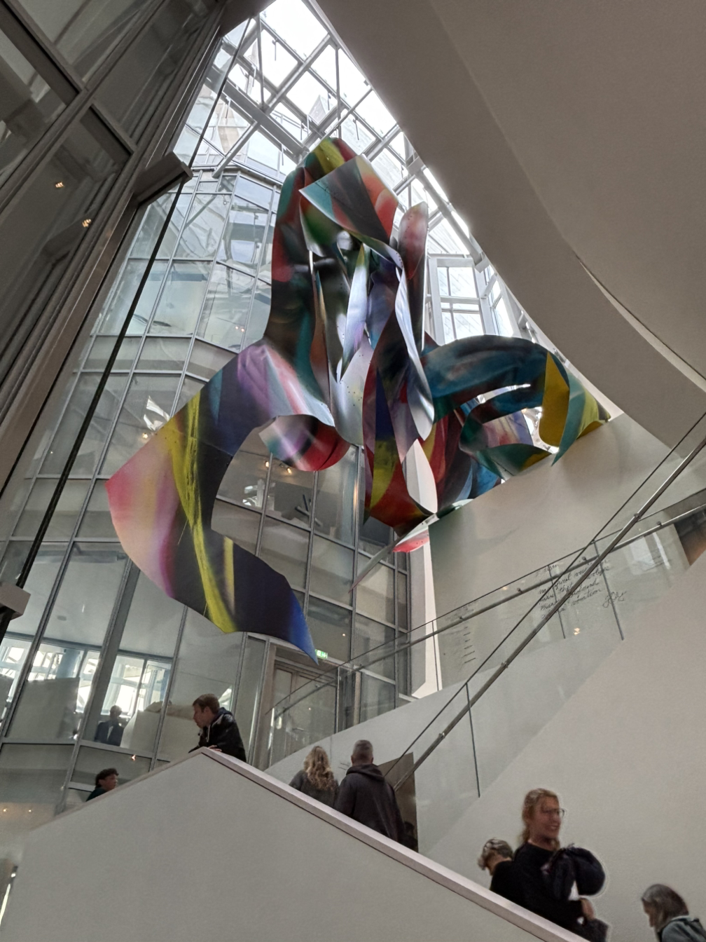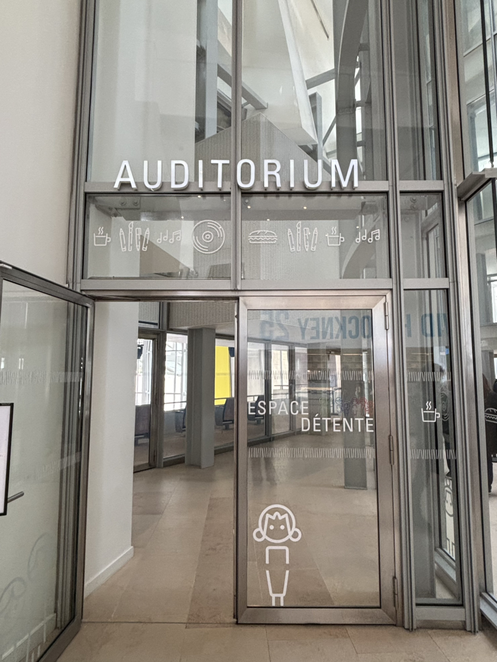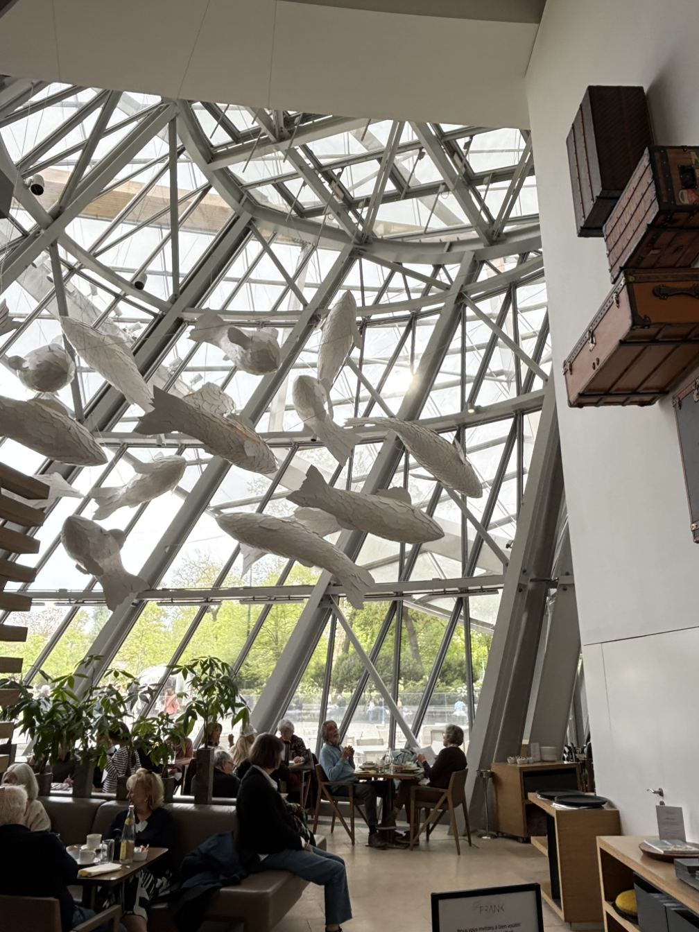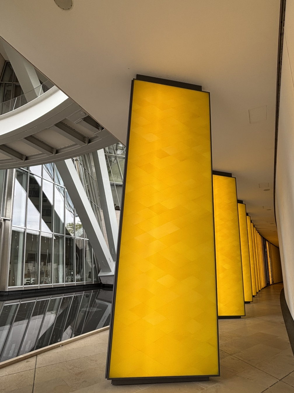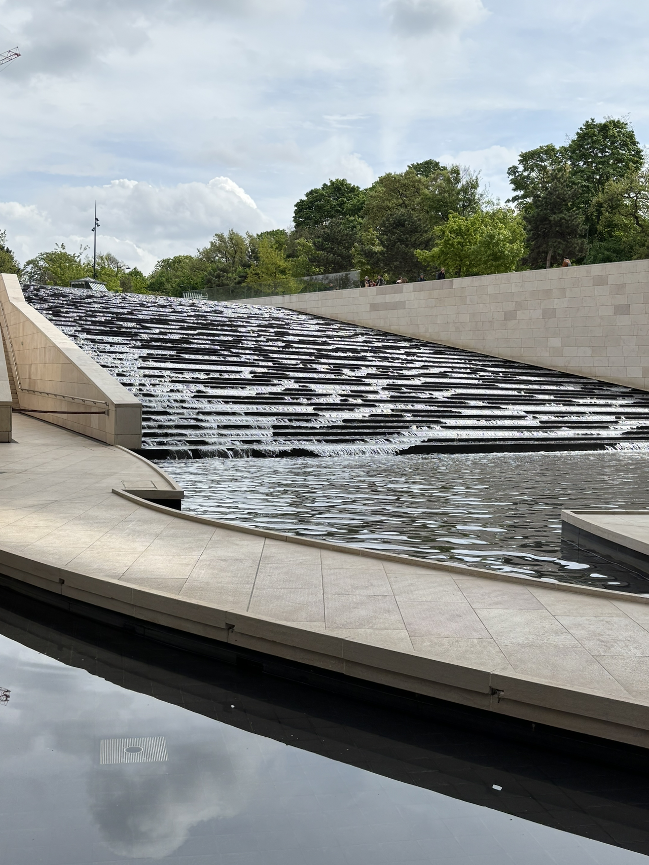 건물은 오픈형으로 어디서든지 쉽게 외부 테라스로 나갈 수 있었고, 건물을 감싸는듯한 계단들로 연결되어 있어서 높은 곳에서 산책하는듯한 느낌이 색달랐어요. 테라스에서는 뜻밖의 작품을 만날 수 있고 주변의 공원과 멀리 파리시내까지 보여 전경이 좋습니다. 미술관내의 오디토리엄에서는 세계 유명 연주자들의 공연이 열리고, 우리의 임윤찬 연주회도 있었다고 합니다. 공연이 없을 때에는 관람객을 위한 휴식공간으로 쓰이고 있었어요. 건물 외부로는 공원이 연결되고, 물이 흐르는 조형물등이 조화롭습니다.
