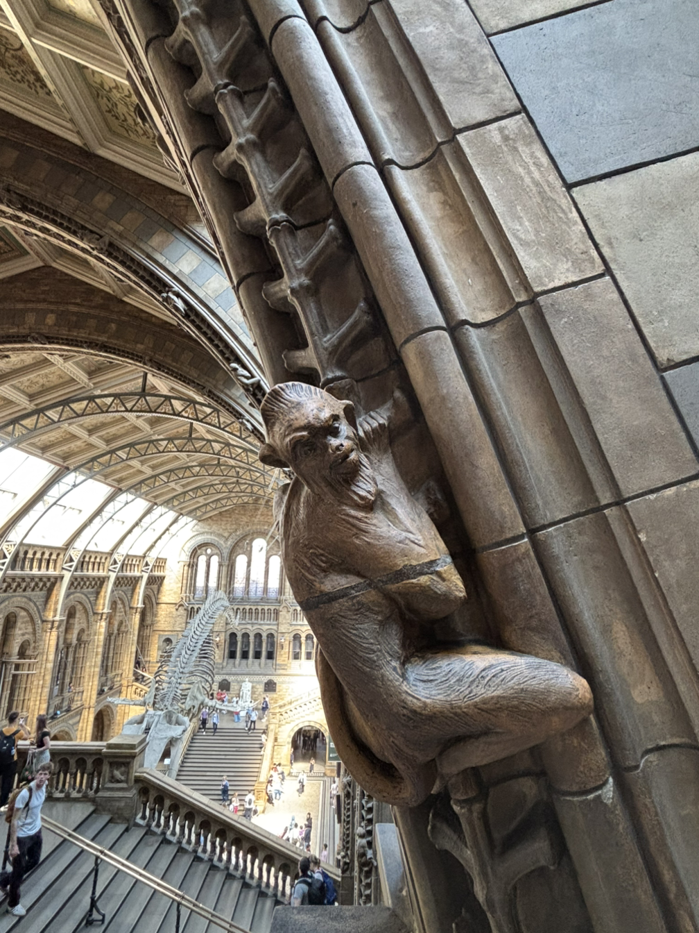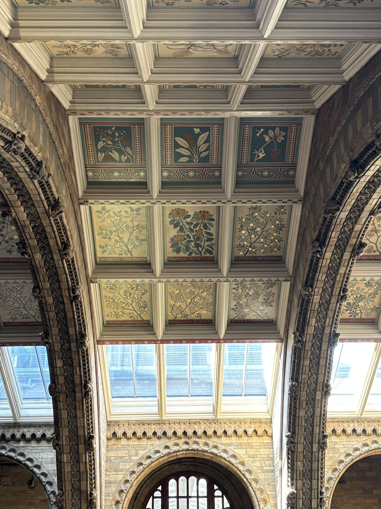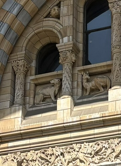 19세기 중반 대영박물관의 자연사 컬렉션은 넘쳐나는 수집품으로 자리가 비좁아졌습니다. 전 세계 탐험을 통한 새로운 수집이 계속되며 전시실은 포화 상태가 되었지요. 건축을 맡게 된 워터하우스는 고딕 리바이벌 양식과 12세기 로마네스크 건축에 자연에서 영감 받은 디테일을 결합하여 건축을 하였습니다. 특히 건물 전체를 테라코타로 장식하는 시도를 했어요. 석조 조각을 하게 되면 시간도 너무 오래 걸리고 비용도 많이 들기 때문에 워터하우스가 석조의 대안으로 생각한 게 테라코타였어요, 굽는 방식으로 제조하면 저렴하고 빠르게 제조할 수 있으니까요. 이미 독일에서 많이 사용하던 기법이었기에 그는 독일을 여러 번 방문하며 연구합니다. 건물 곳곳에 담긴 동식물의 테라코타와 부조를 보며, 건축에 참여한 사람들이 얼마나 자연 과학을 충실하게 표현해 내려고 노력했는지를 느낄 수 있어요.