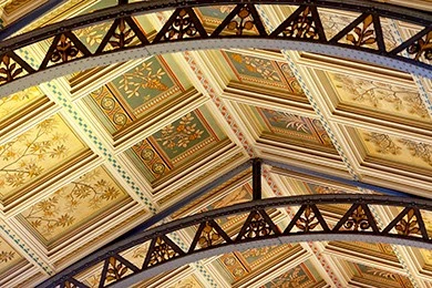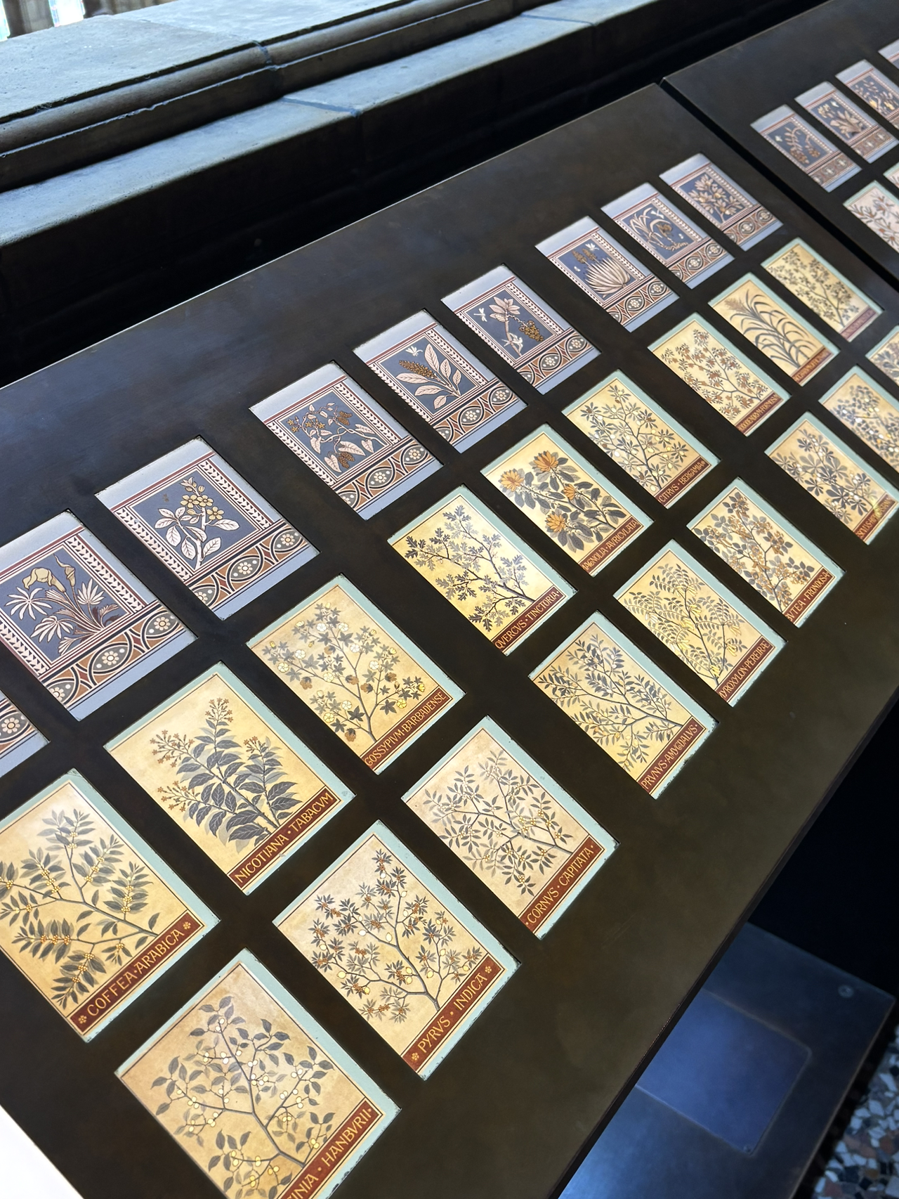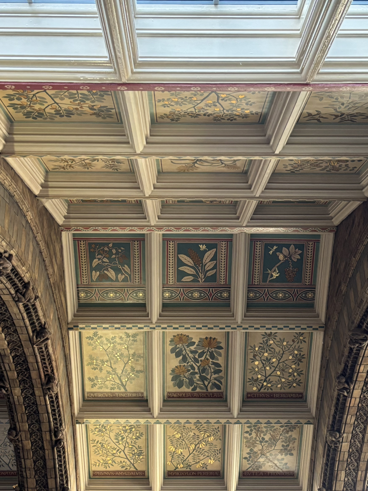 그는 여러 교수들의 자문을 받으며 많은 표본을 모티브로 디자인합니다. 벽타일에는 화석 물고기 문양을 넣고, 건물 곳곳에는 동물을 만들어 넣었습니다. 벽면에는 식물과 동물을 담아 자연을 표현하였고, 기둥은 식물 줄기로 감고, 건물의 외벽에는 가고일을 배치합니다. 멸종되거나 상상 속의 동물은 동쪽 윙에 배치하였고 현존하는 동물은 서쪽 윙에 배치했어요. 홀 중앙의 천장은 각기 다른 162개의 식물그림 패널로 덮어서 천장 자체가 예술품입니다. 일부 패널에는 식물의 이름이 적혀 있기도 합니다. 커피, 담배, 면화, 양귀비 등의 희귀 식물과 해외에서 볼 수 있는 과일 등이 묘사되어 금박으로 장식되었어요. 박물관 3층에 올라가면 천장화에 대한 자세한 설명도 볼 수 있습니다.