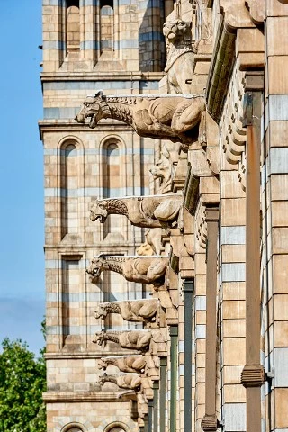 영국의 알프레도 워터하우스 (Alfred Waterhouse, 1830~1905)는 대학교 건물과 교회 예배당등을 많이 남겼습니다. 그의 작품 중 런던의 자연사 박물관은 특별한 곳이지요. 이곳은 1881년 4월 18일에 개관되었고 “자연의 대성당”이라고 불렸습니다. 건물 자체의 모습은 웅장한 성당 같지만, 자세히 살펴보면 외부와 내부 디테일은 동식물로 정교하게 배치되어 있어요. 이런 숨은 디테일을 찾아보는 재미가 쏠쏠한 곳이었어요.