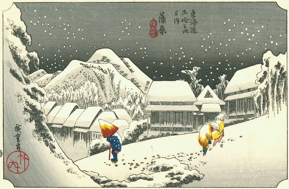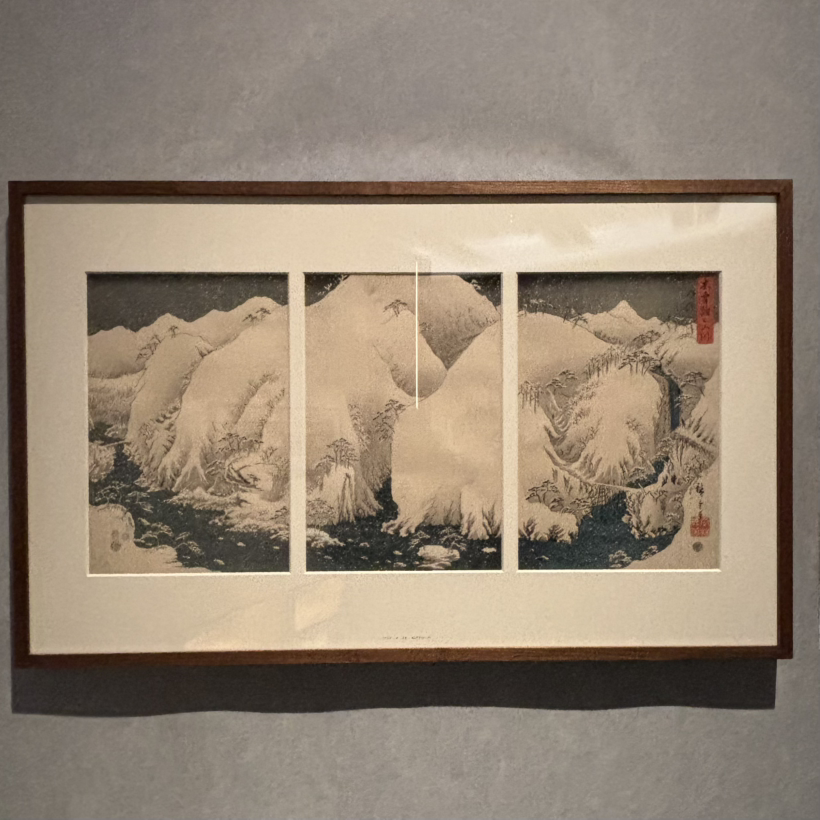 1832년, 히로시게는 교토로의 여행을 허가받게 됩니다. 500km 거리인 에도(동경)와 천황의 수도인 교토를 연결해 주는 도카이도 (東海道)를 따라 길을 나선 그는 700여 점의 판화를 디자인했습니다. 판화를 제작했다는 것은 700점을 남긴 게 아니고, 엄청난 양을 남긴 거겠지요? 여행하지 못하는 서민들에게 타지의 아름다움을 보여주는 역할도 했을 거고요. 풍경화도 여러 테마를 시리즈로 제작했고, 동식물과 당시 유행하던 부채 그림도 상세하고 아름답게 묘사했습니다. 때때로 그림 속 인물은 거대한 풍경 속에서 아주 작게 묘사되었어요. 설경들은 정말 눈 온 뒤의 고요함이 느껴지며 정적이었고요. 초현실적인 그림들은 현대화 같이 느껴집니다. 판화제작이라 사이즈는 다 작습니다.