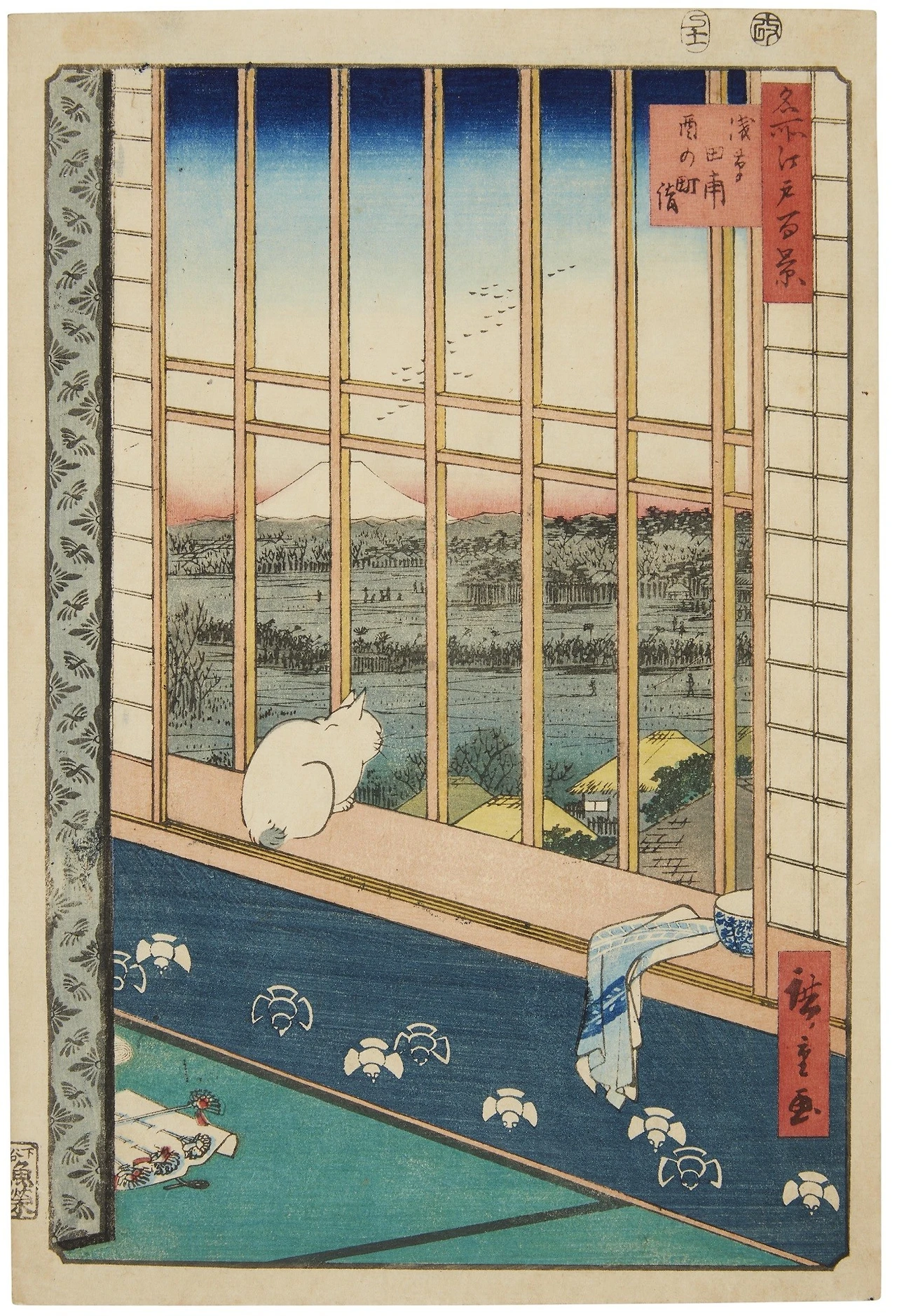 히로시게는 일본에서 가장 많은 작품을 남긴 인기 있는 작가예요. 사회 모든 계층의 삶의 모습과 자연, 풍경을 시적으로 아름답고 섬세하게 묘사했습니다. 그가 살았던 에도시대 말기는 외세의 침략과 기근으로 사회적으로 혼란스러운 시기였지만 그는 의도적으로 불안한 정세는 숨기고 평화로운 모습만 남겼습니다.