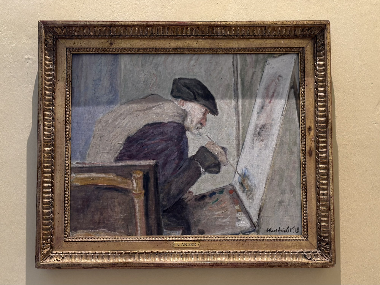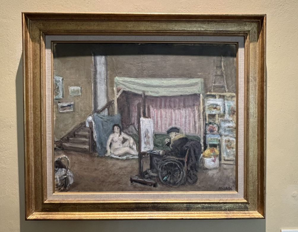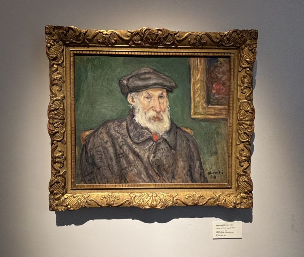 역시 르누아르의 회화 작품은 몇 점 없었어요. 그보다는 알베르 앙드레 (Albert André, 1869~1954)의 작품이 눈에 많이 띄었어요. 이 작가는 또 누구일까, 궁금합니다. 파리에서 활동했던 작가는 1894년 5점의 작품을 가지고 미술전에 참가했는데 이때 르누아르의 주목을 받게 되었고, 나이차이가 꽤 많이 나지만 두 사람은 친한 친구가 됩니다. 앙드레는 1917년 제1차 세계대전에서 전역한 뒤에 프랑스 남부의 마르세유로 이주했고 근방의 바뇰쉬르세즈 (Bagnols-sur-Cèze)의 박물관에서 큐레이터로 일했어요. 그가 이곳에 사는 동안에 르누아르의 모습을 많이 남긴 듯합니다. 앙드레의 작품을 통하여 휠체어에 앉아 작업하고 있는 노년의 르누아르 모습을 볼 수 있어요. 상세한 배경에서 작업실의 분위기가 느껴지고 르누아르의 굽은 등과 뭉툭한 손, 그리고 주름진 얼굴도 볼 수 있었습니다.