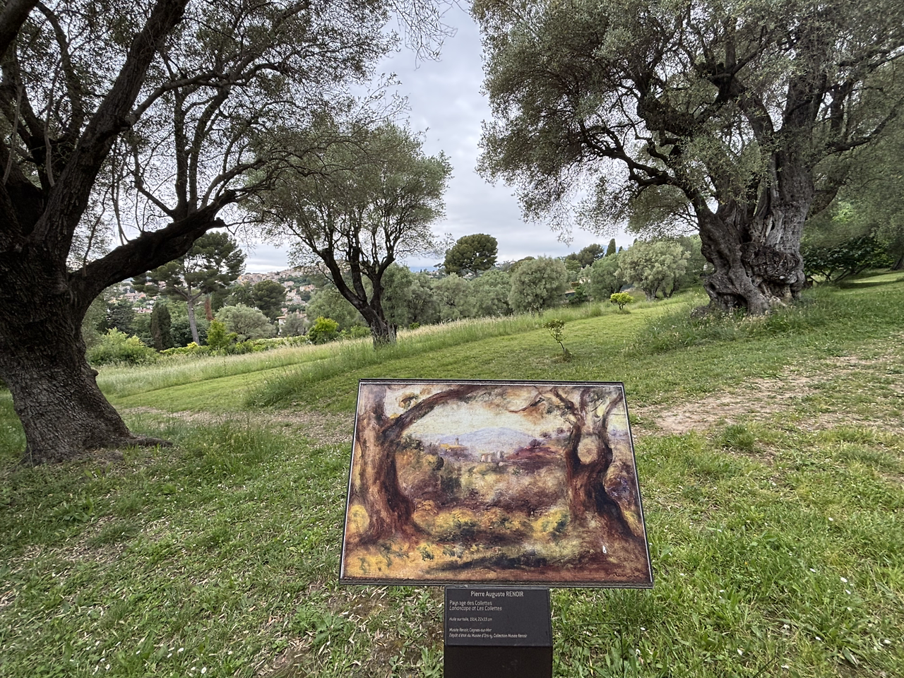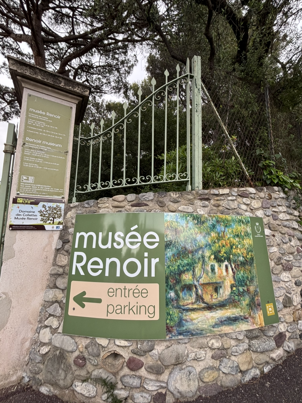 얼마 전에 방문한 파리의 몽마르트르 미술관에서 오귀스트 르누아르 (Auguste Renoir, 1841~1919)의 흔적을 보았었지요. (1875~1876 거주) 이후 그는 파리와 에소아(Essoyes)등 여러 지역에서 지내며 명성을 쌓아갔습니다. 시간의 흐름을 좇아 노후의 르누아르가 프랑스 남부에서 지낸 곳을 찾아갔습니다. 니스에서 서쪽으로 12km 정도 떨어진 카뉴쉬르메르 (Cagnes-sur-Mer) 마을에 르누아르 미술관이 있습니다. 니스빌 기차역 (Nice-Ville)에서 서쪽으로 4 정거장 떨어져 있어서 금세 도착합니다. 이 마을은 지금도 주거지역으로, 오래된 돌담에 붙어있는 미술관 사인판조차도 소박했어요. 이 미술관에는 르누아르의 진품이 13점 여점밖에 없어 실망스럽다는 리뷰들이 있었지만, 저에게는 많은 작품을 보는 게 중요하지 않았어요. 한 대가가 죽음을 맞이할 때까지 머물며 후기 작업을 한 공간을 보고 싶었습니다.