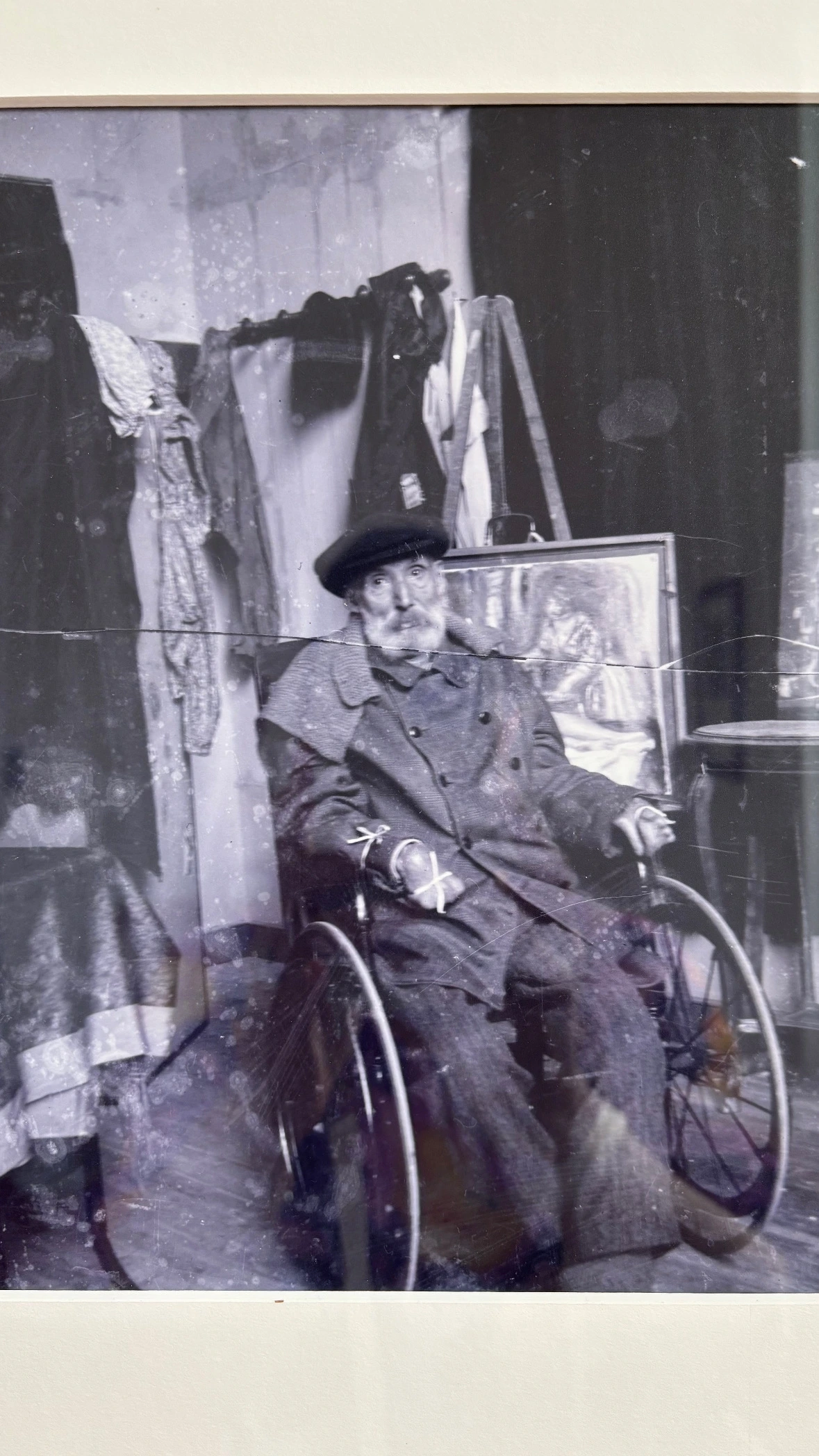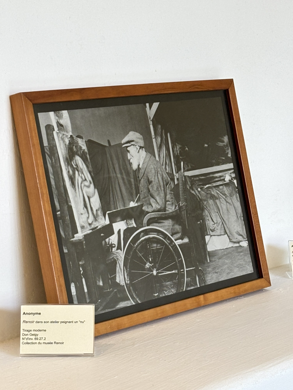 르누아르는 아내가 56세인 젊은 나이로 1915년에 먼저 세상을 떠난 후에는 아내의 사진을 보며 모성애가 담긴 조각작품들을 남겼습니다. 당시의 르누아르의 모습을 담은 사진 몇 점이 미술관에 걸려있는데, 그는 이젤 앞에서 너무나 인자한 할아버지의 모습으로 휠체어에 앉아있어요. 양손은 붕대로 감겨있는데 손가락 모두가 안쪽으로 굽어 들어서 붕대로 감은 손은 마치 손가락이 없는 듯 뭉툭해 보입니다. 저 손으로 어떻게 그림을 그리고 조각을 할 수 있었다는 건지, 물리적으로 불가능해 보였어요. 류머티즘 관절염을 앓았다고는 들었지만, 저렇게 까지 손이 안으로 굽다니 충격적인 모습이었습니다. 더군다나 손이 변형되면서 손톱이 손바닥을 파고들었다고 해요. 아무리 인내심 있는 할아버지였지만, 너무 처참하지 않나… 그러나 그의 표정은 온화하기만 합니다.