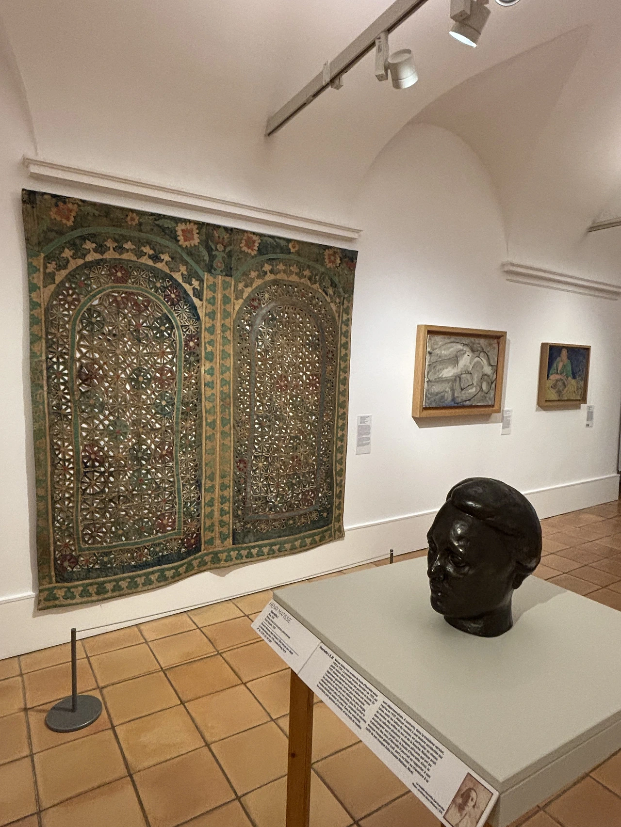 또한 수집가였던 그는 아프리카, 아시아, 오세아니아 등 다양한 지역의 문화에 관심을 가졌고 그곳의 유물을 수집했어요. 이슬람 마샤라비야 (Mashrabiya) 문양의 장식품과 무어인(Moor, 이슬람계로서 이베리아반도와 북아프리카에 살았던 사람들)이 사용하던 향로, 중국 화병, 티베트의 불교 그림인 탕카 (thangka painting)도 볼 수 있습니다. 여행을 통하여 비서양 문화를 만나는 것은 마티스에게 중요한 영감의 원천이었어요.