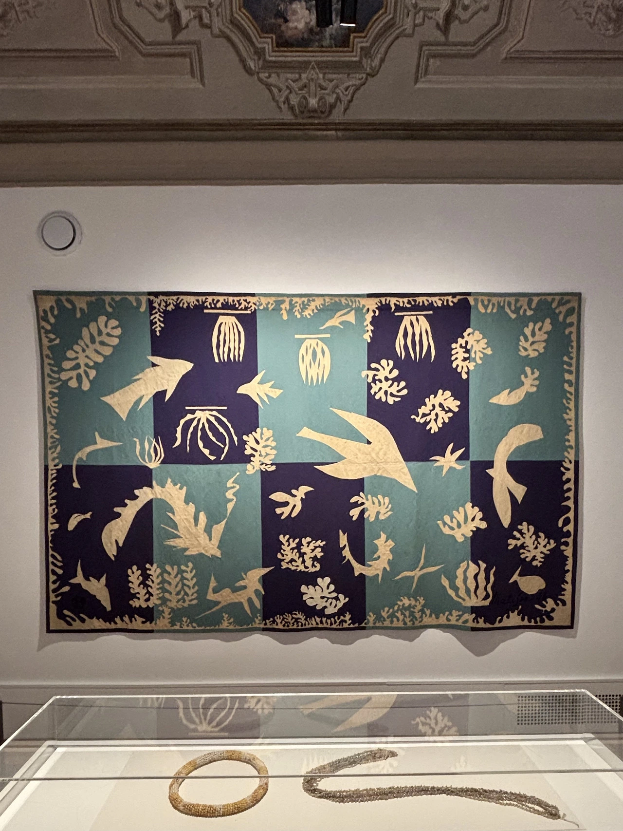 미슬관에 들어서면 대형 컷아웃 (cut-outs) 작품이 눈길을 사로잡습니다. 마티스가 노후에 병상에 누워서 제작한 작품으로 그의 컷아웃 중 가장 규모가 큰 작품으로 가로길이가 8m 높이는 4m가 넘는 작품이에요. 그는 밝은 색의 구아슈 종이를 잘라내어 영감이 떠오르는 대로 벽에 붙여보며 이리저리 조합해 보고 대칭으로 오리며 꽃과 과일을 표현했어요. 그의 말년에 제작된 이 컷아웃은 마티스에게는 우상향만 있을 뿐 하강곡선은 없었음을 보여줍니다.