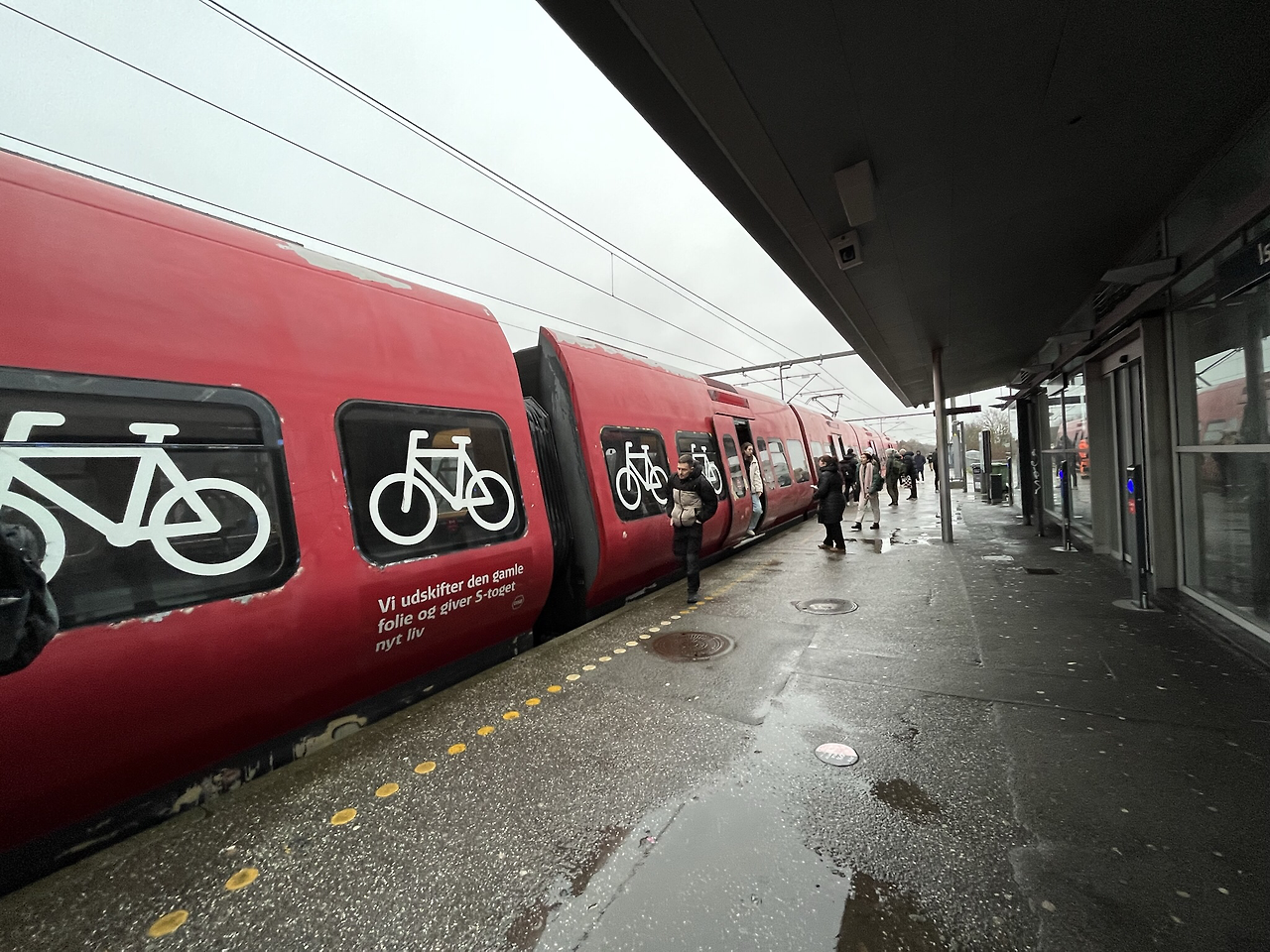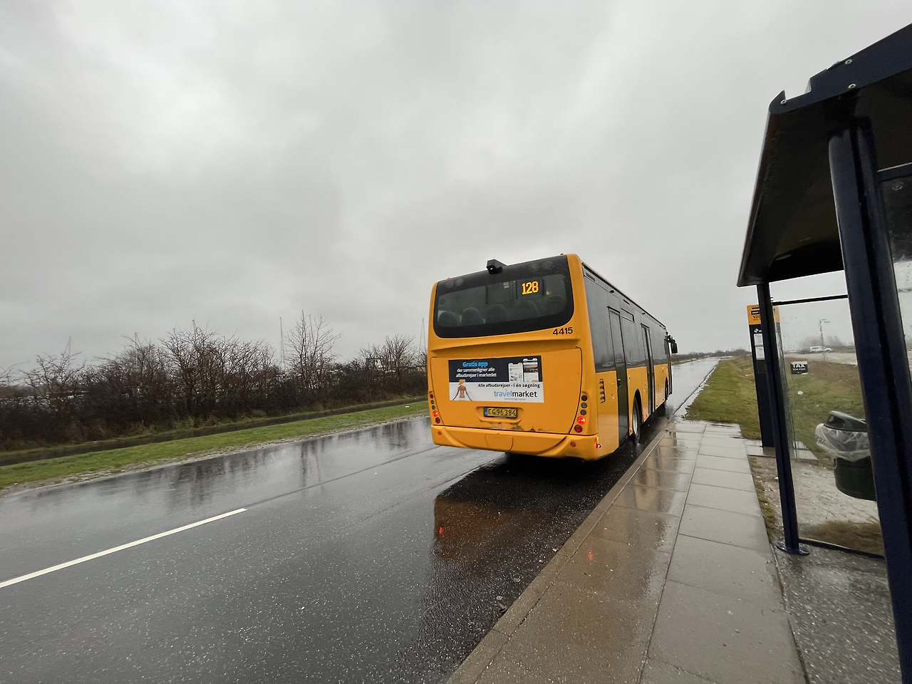 바쁘게 출근하는 사람들 틈에서 나도 따뜻한 라테와 빵을 산다. 이름은 모르겠지만 위에 검정깨가 뿌려진 빵이 참 맛있다. 덴마크는 레스토랑의 빵은 말할 것도 없고, 기차역에서 빵을 사도 맛이 좋다. 코펜하겐 중앙역에서 기차로 남서쪽으로 15분 정도 이동하면 Ishøj라는 바닷가 소도시가 나온다. 15분이면 너무 가깝지 않은가. 빠른 기차도 아닌 아주 천천히 이동하는 기차를 타니 마음이 여유로웠다. 기차를 타고 바깥 풍경을 보다 보니 어느새 Ishøj에 도착해서 버스로 갈아탄다. 미국의 스쿨버스처럼 노란색인 버스가 일반 버스이다. 몇 정거장 지나서 금방 미술관 앞에 정차를 한다. 우리 말고도 몇 가족도 함께 하차를 했다. 문제는 비바람이 몰아치는 중에 버스에서 하차를 해야 했는데 이렇게 강력한 바람은 처음이었다. 미술관 입구가 그다지 멀지 않은데 앞으로 걸어 나갈 수가 없을 정도로 강력한 바람으로 가져간 우산살은 완전히 뒤집어지면서 꺾이고 휘어졌다. 옆 가족의 어린 아들은 걷다가 바람에 놀랐는지 울면서 뛰어가는데 미안하지만 너무 귀여웠다. 다행히 나올 때는 빗줄기가 가늘어져서 사진을 한 장 찍어보았다.