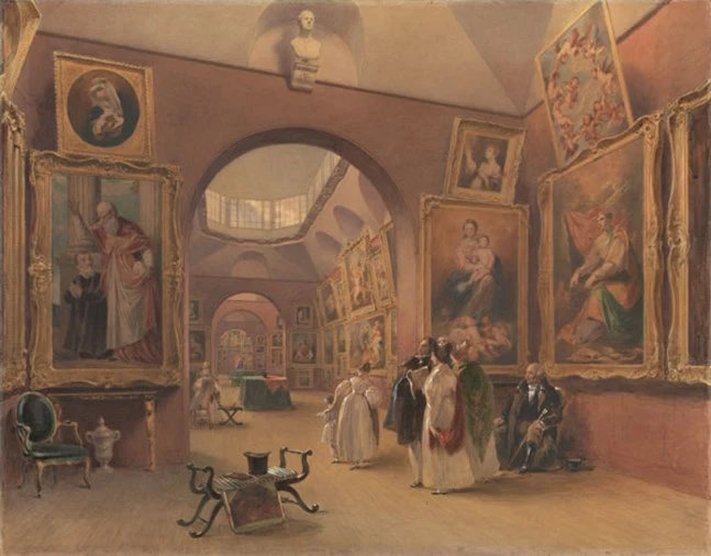 2017년 갤러리의 200주년을 기념하여 공개된 James Stephanoff(1784-1874)의 수채화인 The Viewing at Dulwich Picture Gallery는 1830년대의 갤러리의 화려한 전경을 보여준다. 지금과 다를 바 없는 인테리어는 John Soane경이 독특한 ‘Dulwich Red'로 벽을 다시 칠한 직후에 그려졌을 가능성이 높다고 한다. 이 그림 안에는 현재 갤러리가 소장한 주요 작품들이 묘사되어 있다