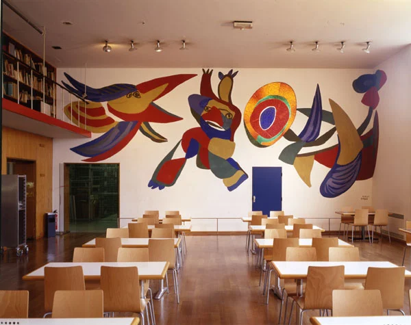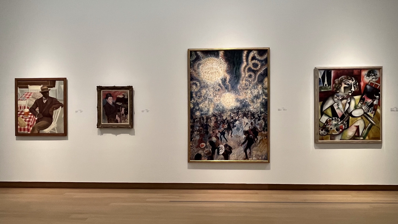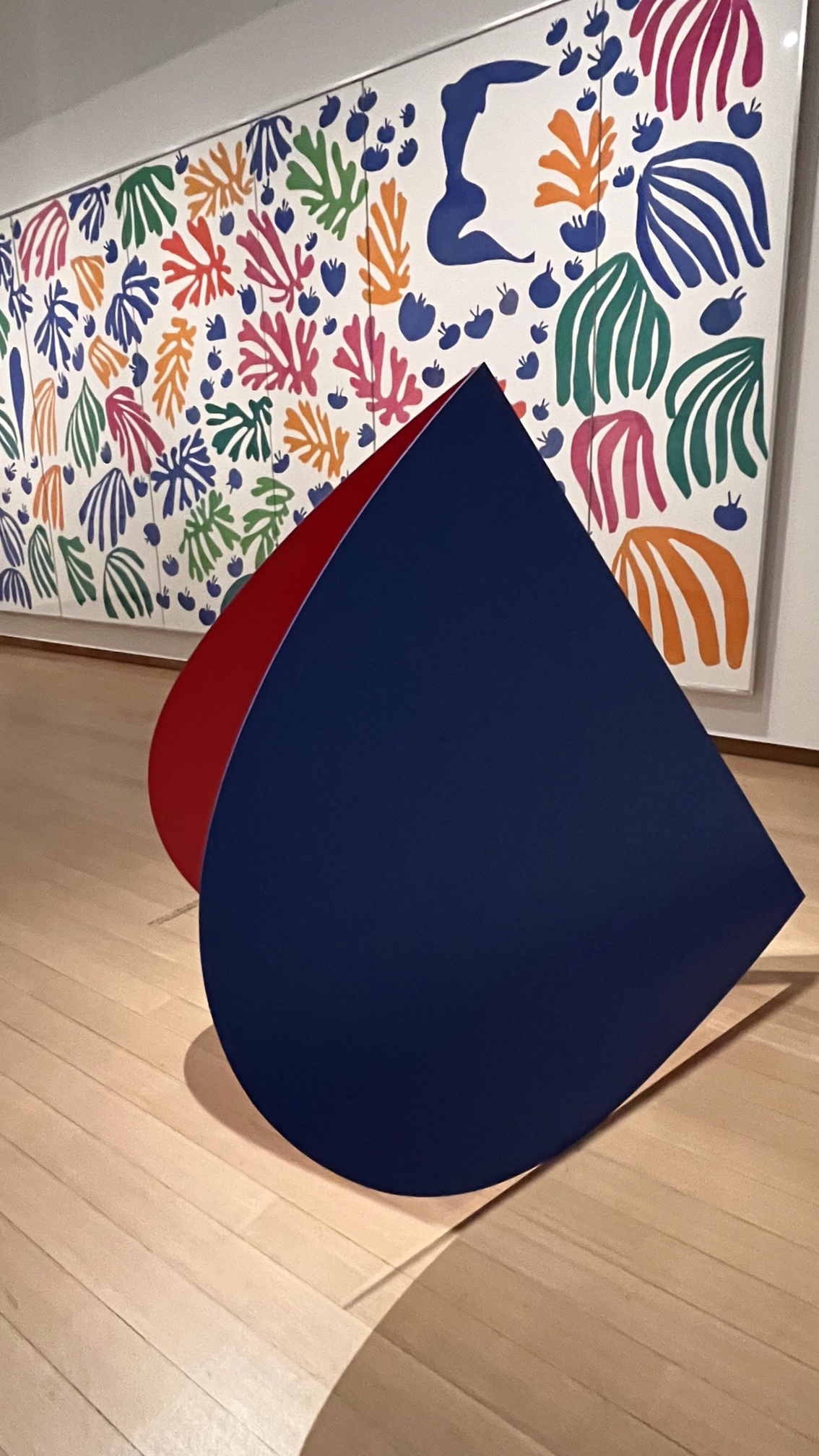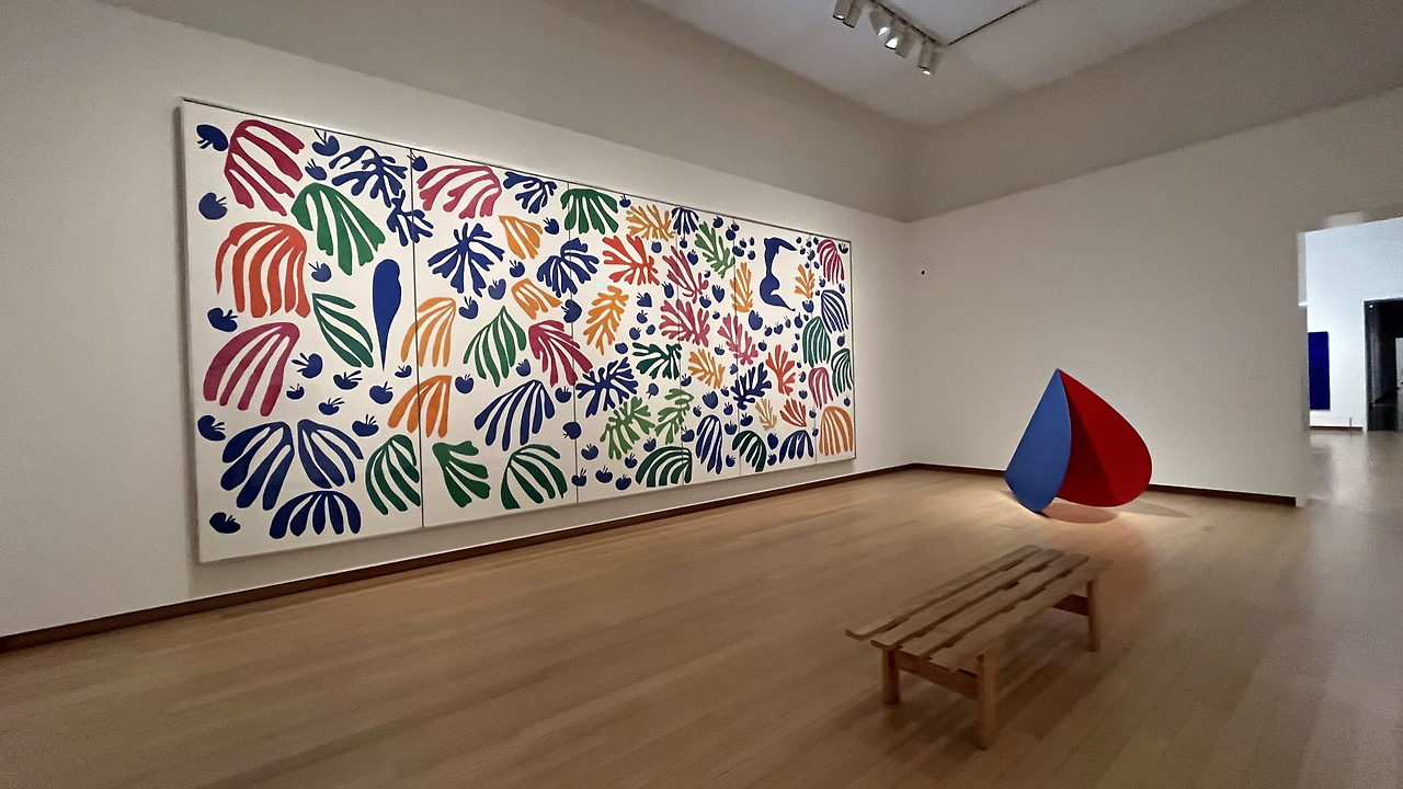 Henri Matisse의 대형 컷아웃 작품과 그 앞에 딱 어울리는 색감의 조각품 Ellsworth Kelly의 <Blue Red Rocker>이 있다. 비록 Kelly는 자신은 Matisse의 영향을 받지 않았다고 직접적으로 부인해 왔지만, 어쨌든 두 작품을 함께 배치하니 잘 어울린다. Kelly 자신에게 조각이란 내가 벽에서 떼어낸 그 자체라고 했는데 그러고 보니 블루레드는 정말 벽에서 떼어낸 듯했다. Matisse의 컷오프 작품은 병석에서 작업하던 그가 ”내가 걸을 수 있는 주변의 작은 정원“을 표현한 것으로 그림 안에서 나뭇잎, 석류, 앵무새(왼쪽), 그리고 인어(오른쪽)를 발견할 수 있다. 미술관은 Marc Chagall (1887-1985)의 작품도 40여 점 소유하고 있는데, 그중에서 눈에 띄는 자화상은 제목처럼 손가락이 7개였다. 재활용 병뚜껑을 활용한 대형 조각품으로 유명한 가나 예술가인 El Anatsui (1944-)의 기념비적인 작품 <In the World But Don’t Know the World> 도 볼 수 있다. El Anatsui는 2001년부터 술병에서 발견한 뚜껑을 이용해서 이와 같은 작품을 제작해 왔다. 조각품은 엄청난 규모로 멀리서 보아도 압도적이고 가까이서 자세히 보면 보석 같은 디테일이 매력적이다. 수천 개의 병뚜껑을 자르고 펴고 비틀고 접으면서 작품으로 만들어내어 인간 공동체의 상호작용을 보여주려고 한다. 또한 술병은 아프리카 식민지 역사를 되새겨주고 버려진 병들을 통하여 소비세계의 부정적인 측면과 환경문제의 메시지를 전달하고 있다. 네덜란드의 화가인 Karel Appel의 작품들은 민속예술과 어린이 미술등의 스타일로 흥미로웠다. 거의 대부분 처음 보는 현대미술들이었지만 눈이 즐겁고 흥미롭고 작가와 그림들에 대해서 더 알아보고 싶은 의욕이 생기는 미술관이었다.