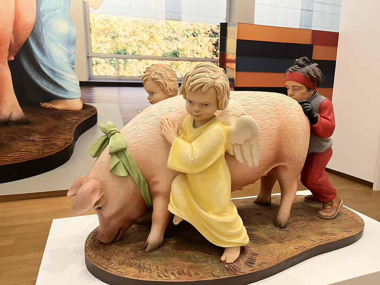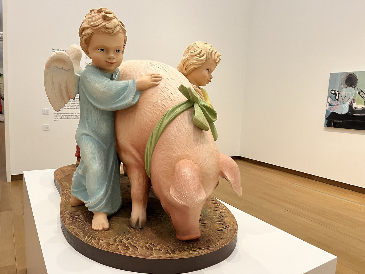 몇 가지 눈에 띄는 작품 중에 내가 좋아하는 작가 Jeff Koons (1955- )의 작품 <USHERING IN BANALITY> 은 무조건 반가웠다. 작품의 제목은 ‘진부함 (따분함)의 도래’ 정도로 해석할 수 있을 거 같다. Stedelijk Museum이 1989년 Jeff Koons의 초기 작품일 인수했을 때 네덜란드에서는 난리가 났다고 한다. 많은 사람들은 왜 이 작품을 그렇게 큰돈을 주고 매입했는지 이해할 수 없었다. 이 작품이 과연 예술품인지, 아니면 순수하게 키치 (Kitsch, 고급예술과 정통예술의 반대말)로 봐야 할지, 과연 작가를 이 시대의 유명한 예술가로 인정해야 하는지, 또한 그가 100명 이상의 조수를 거느리고 공장에서 제품을 생산해 내듯이 만들어낸 작품을 과연 예술품이라고 할 수 있을지, 30여 년 전의 반응이니 충분히 이해가 간다. 2012년 독일 프랑크푸르트에서 우연히 Jeff Koons의 전시를 본 적이 있다. 우리가 알고 있는 다양한 조각뿐만 아니라 사진 수십 점이 전시되었다. 그때 본 충격은 잊을 수가 없다. 전시명은 <Made in Heaven> 1989년에 발표한 시리즈였는데, 알고 보니 그의 주전공은 포르노그래피였다. 일반적인 사진은 아니고 유리나 캔버스등에 인쇄하고 사이즈도 커서 굉장히 멋지긴 했다. 상상을 뛰어넘는 그의 포르노 작품들은 절대로 사진촬영은 금지였고, 인쇄물이나 책으로 나오지 않았다. 작품의 주인공은 Jeff 본인과 그의 부인이었다. 부인인 Cicciolina는 유명한 포르노 배우이자 이탈리아에서 급진당 국회의원까지 지냈다. 그는 부인과의 결혼으로 유명해졌고, <Made in Heaven>으로 더 유명해졌을 거다. 그는 어느 순간부터 자신의 결혼생활을 예술로 표현하던 포르노그래피 작업을 그만두고, 대중들의 사랑을 흠뻑 받을 만큼 사랑스럽고 귀여운 강아지 시리즈를 선보이며 더 인기 있는 작가가 된다. 그의 작품가격은 치솟아 오르고 생존하는 작가 중 가장 비싼 작품들을 선보이고 있다. 그의 기발한 아이디어로 탄생한 포르노 작품이건 동화 속에 나올법한 예쁜 조각이건 내 눈을 호강시켜 주니 나에게는 모두 다 훌륭한 작품으로 여겨진다.