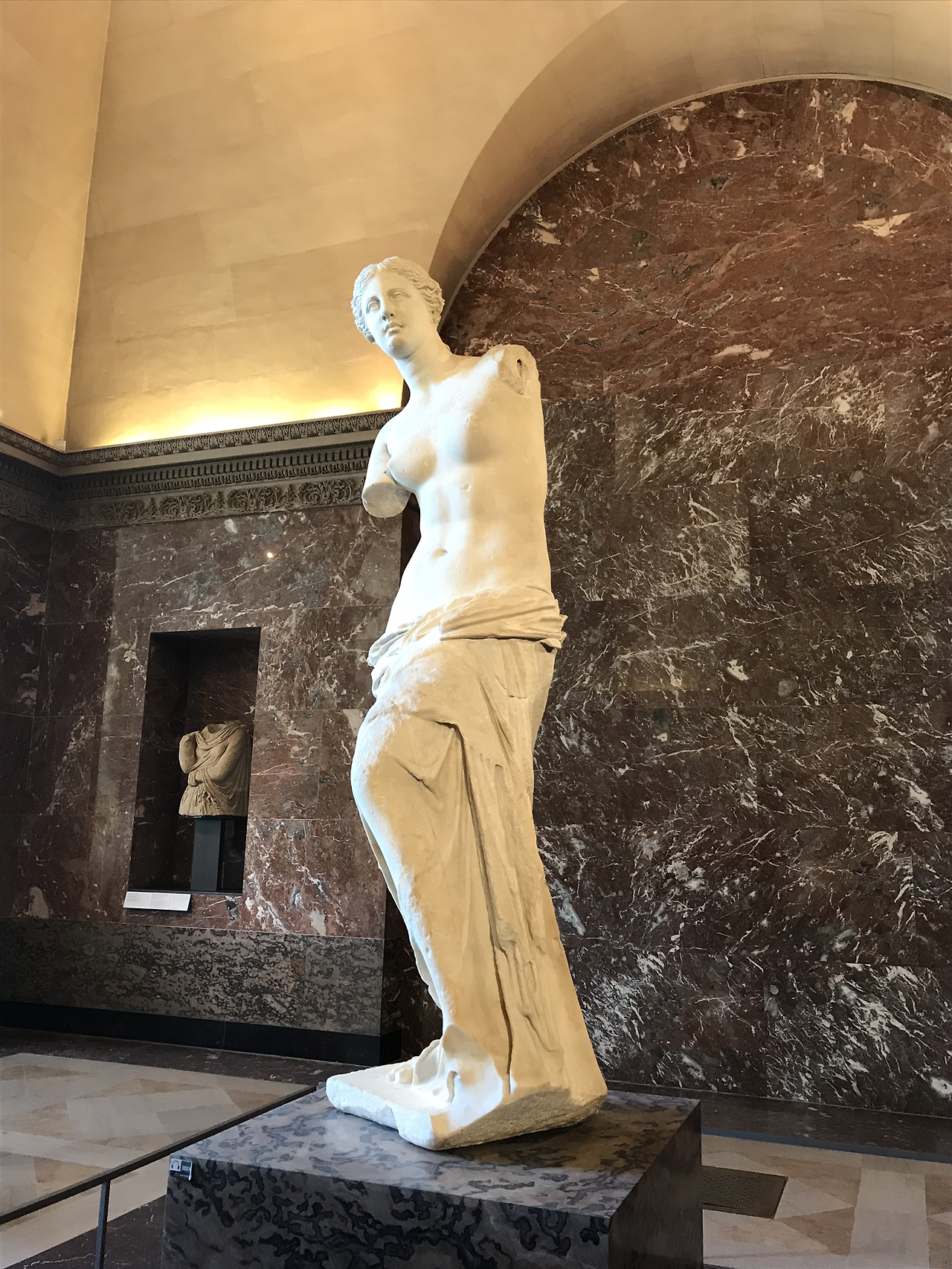<사모트라케의 니케>보다 더 먼저 루브르에 소장된 그리스 조각상이 있으니 <밀로의 비너스>이다. 기원전 130년에서 100년 사이에 제작된 것으로 추정되는 비너스는 그리스신화에서 사랑과 미를 관장하는 여신인 아프로디테를 묘사한 대리석상이다. 높이는 2미터가 넘고 8등신의 황금비율이다. 두 팔은 남아있지 않지만 다양한 연구자료에 의하면 왼팔로는 사과를 손에 쥐고 있었을 것이고 오른손으로 흘러내리는 옷을 잡고 있었을 거라 추정한다. 이 작품은 1820년 4월 8일에 당시 오스만제국의 영토였던 밀로스섬에서 한 농부에 의해서 발견되었고, 당시 오스만 제국 주재 프랑스 대사가 구매하여 1821년부터 루브르에 소장되었다.