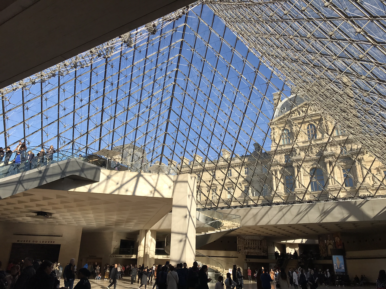 원래는 박물관 입구가 길가 쪽으로 여러 곳에 있었는데 몰려드는 관람객을 원활하게 입장시키기 위하여 중앙에 입구를 만드는 방안이 모색되었다. 1981년 당시 프랑스 대통령이었던 미테랑은 그랜드 루브르 프로젝트를 발표하였고, 이듬해에는 중국계 미국인 건축가 I.M.Pei가 이 프로젝트를 맡게 된다. 프로젝트는 공항이나 터미널처럼 넓은 공간에서 티켓팅하고 각자의 목적지로 분산되는 구조로 고안되었다. 1989년 완공된 피라미드는 파리의 랜드마크가 되었으나 건축가 선정 단계에서부터 완성된 후까지 반대와 비난여론이 많았다. 에펠탑 건설 때도 그랬듯이 파리와 어울리지 않는 건축물이라고 여론의 질타를 받았다. 또한 피라미드는 고대 이집트의 죽음을 상징하기 때문에 루브르 안뜰에 건축되기에는 부적절하고, 고전적인 르네상스 스타일인 루브르와 모던한 유리 건축물은 어울리지 않으며, 중국계 미국인 건축가는 프랑스의 랜드마크를 맡을 만큼 프랑스 문화를 이해하지 못한다고 미테랑 대통령을 공격했다. 그러나 에펠탑도 그랬듯이 피라미드는 파리의 명소가 되었고, 보면 볼수록 더 멋지게 느껴진다. 아직 어둑어둑한 겨울의 이른 아침에 도착한 피라미드 앞뜰은 조명과 여명이 한데 어우러져서 신비롭기까지 하다. 고미술품과 유물들을 만나러 들어가는 관문으로 묘하게 잘 어울린다고 생각된다.
