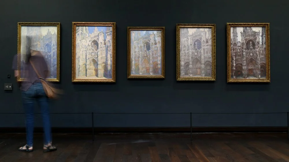 인상파 작품들은 대부분 크기가 작은 편이다. 19세기에는 증기 기관차도 생기며 이동이 편리해지기도 했고, 1841년에는 밀봉이 가능한 튜브 물감이 발명되면서 야외 작업이 편해졌기 때문이다. Claude Monet (1840-1926)의 <루앙 대성당의 그림>을 처음 만났을 때의 장면이 마음속에 그대로 남아있다. 이 작품은 모네가 1892년부터 노르망디의 작은 도시 루앙에서 2년여간 머무르면서 그렸다. 대성당 길 건너편에 임시 스튜디오를 임대하고 총 30여 점의 루앙 성당을 그려가며 빛을 연구했다. 그의 나이가 52세 정도 되었을 때니 이미 인상파 화가로 자리 잡고 경제적으로도 안정되었던 시기였을 거다. 그럼에도 불구하고 모네는 회화에 한계를 느끼며 불만족스러웠고 이 좌절감을 해소하기 위하여 건초더미와 루앙성당과 같은 단일 주제를 가지고 빛 표현 방법을 집중적으로 연구했다. 그는 계절과 날씨, 빛의 움직임에 따라서 피사체가 변화하는 모습에 깊은 인상을 받았고 다양한 색을 사용하여 피사체가 품은 빛을 표현했다. 이 작품을 보면서 모네 같은 대작가도 타고난 재능만 가지고 그리지는 않았구나. 끊임없이 관찰하고 고민하고 노력한 흔적이 남아있구나 싶었다. 성당은 하나하나 독립적인 작품으로만 봐도 모두 다 명작이다. 이런 집요함과 끈기, 그리고 고찰의 과정이 있었기에 이후에 <수련> 시리즈가 나올 수 있지 않았을까.