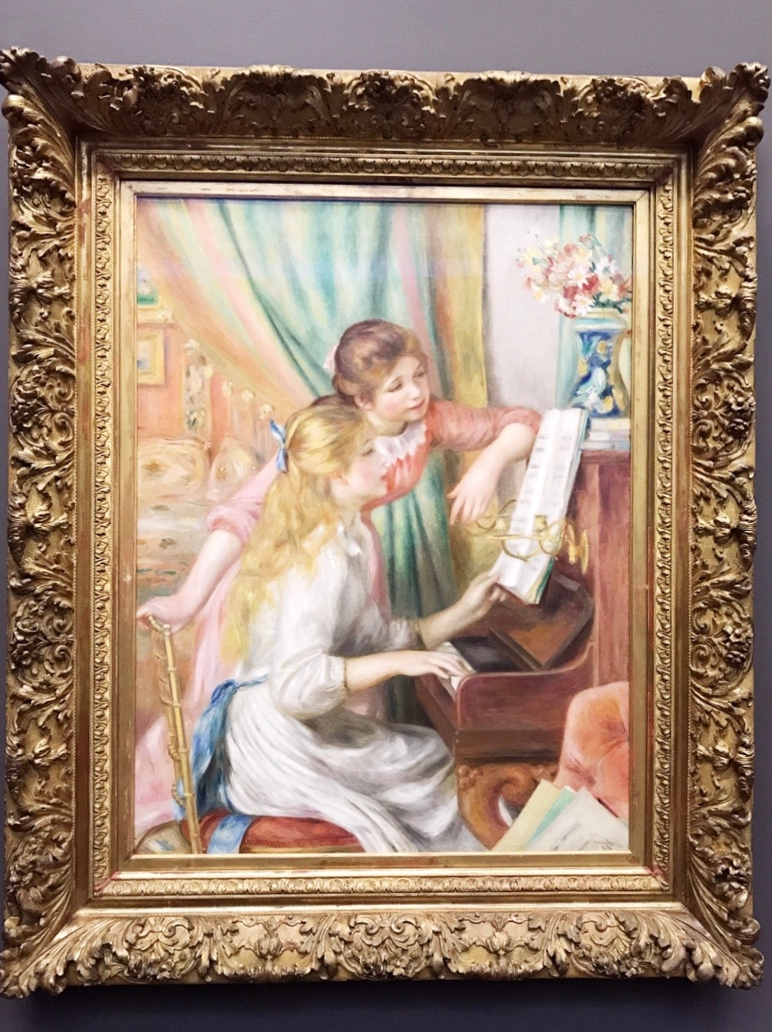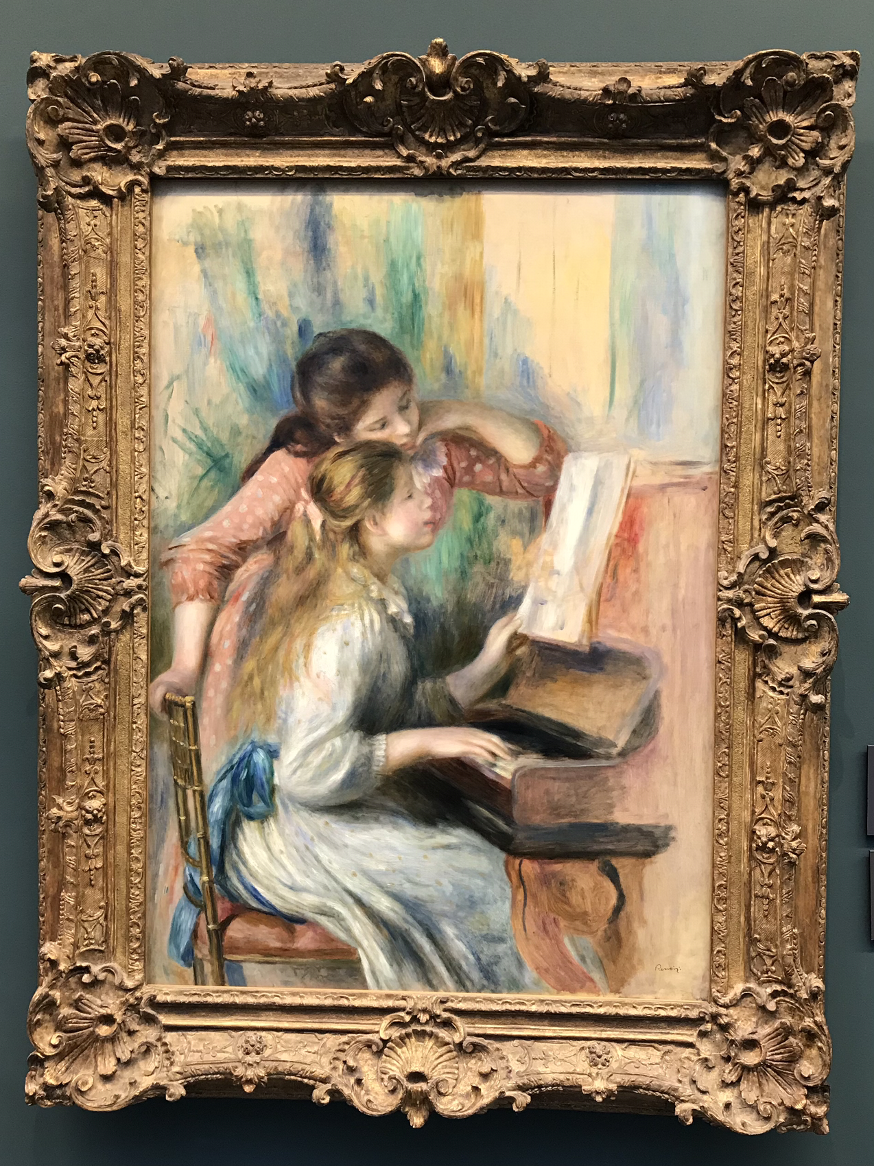 인상파 작품들은 어떤 기준으로 오랑주리와 오르세 미술관 두 곳에 나뉘어 있는 것일까. 오랑주리에 있는 인상파 작품들은 개인이 수집한 컬렉션으로 Paul Guillaume와 Jean Walter가 수집하였다. 열정적이었던 젊은 아트 딜러 Paul Guillaume이 1934년에 42세로 사망하면서 그의 미망인 Domenica가 컬렉팅을 이어 나갔다. 그녀는 몇 년 후에 광산 사업으로 큰돈을 번 건축가 Jean Walter와 재혼을 하게 되고, 지속적으로 미술품을 사고팔며 1860년에서 1930년대 인상파 작품으로 컬렉션을 완성해 나간다. 이후 국가에서 그녀의 컬렉션을 구매하게 되었고, 그녀는 두 남편의 성을 따서 The Walter-Guillaume collection으로 이름 지어달라고 요청했다. 이렇듯이 컬렉션의 중심에는 처음부터 끝까지 Domenica가 있었고, 그녀의 사망 후인 1984년부터 148점의 인상파 작품들은 오랑주리에서 영구적으로 전시되고 있다. 특히 Pierre-Auguste Renoir (1841-1919)의 작품들은 아름다움 그 자체이다. 르누아르의 환상적인 색감을 글로 표현할 형용사가 마땅치가 않아 아쉬울 정도이다. 그의 <피아노 앞의 소녀들, 1892>은 비슷한 작품이 여러 점 전해지는데, 그중에 한 점은 오르세 미술관에 또 한 점은 오랑주리 미술관에 있다. 가까운 곳에 위치한 두 점을 비교해 보아도 흥미롭다.