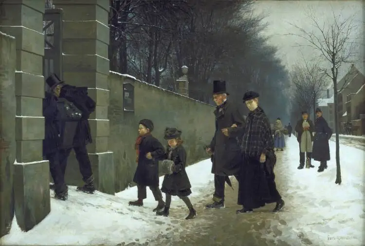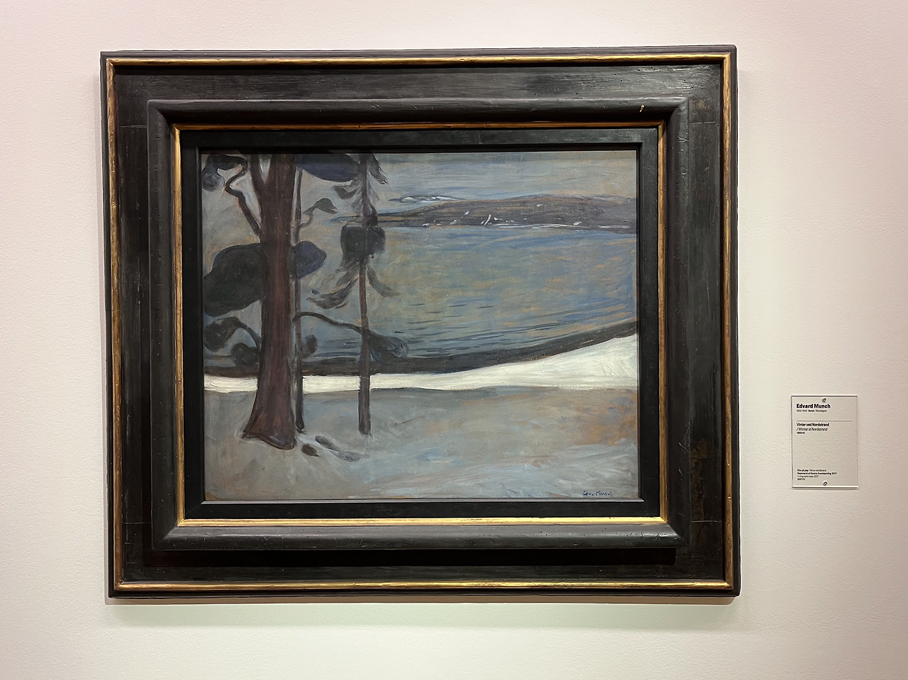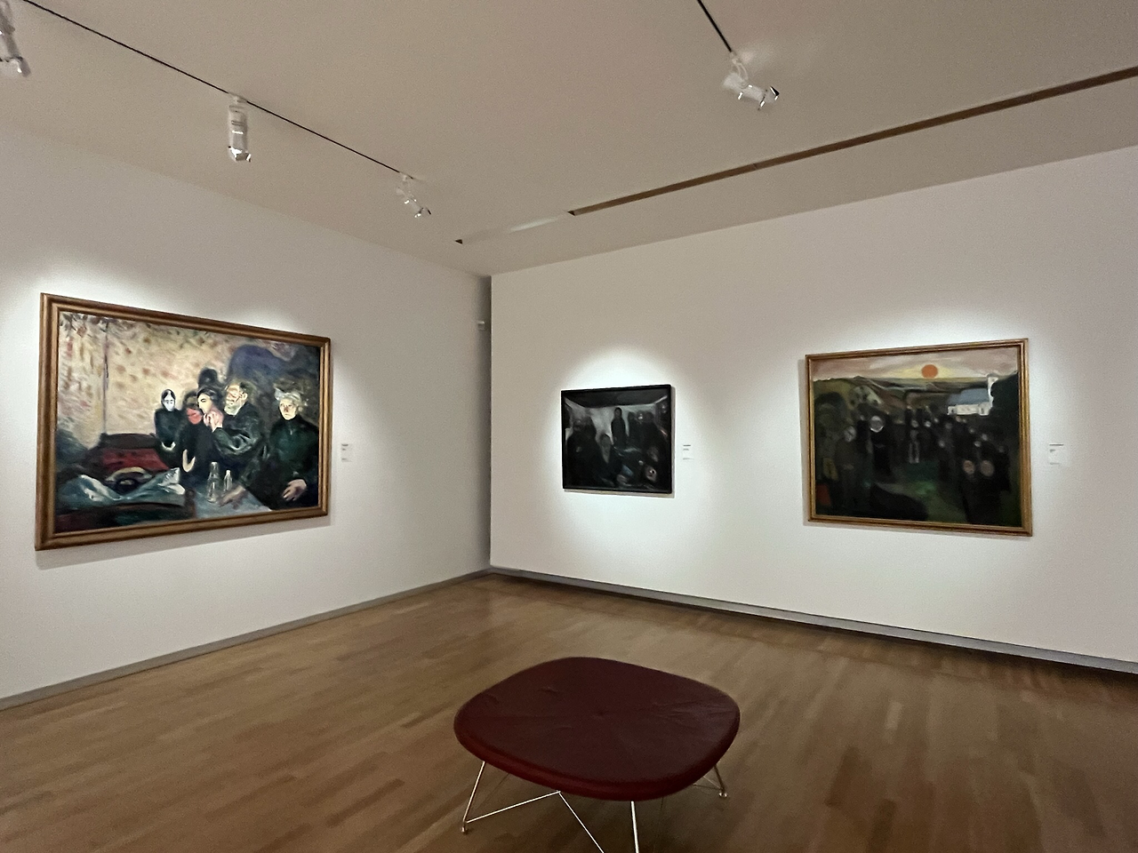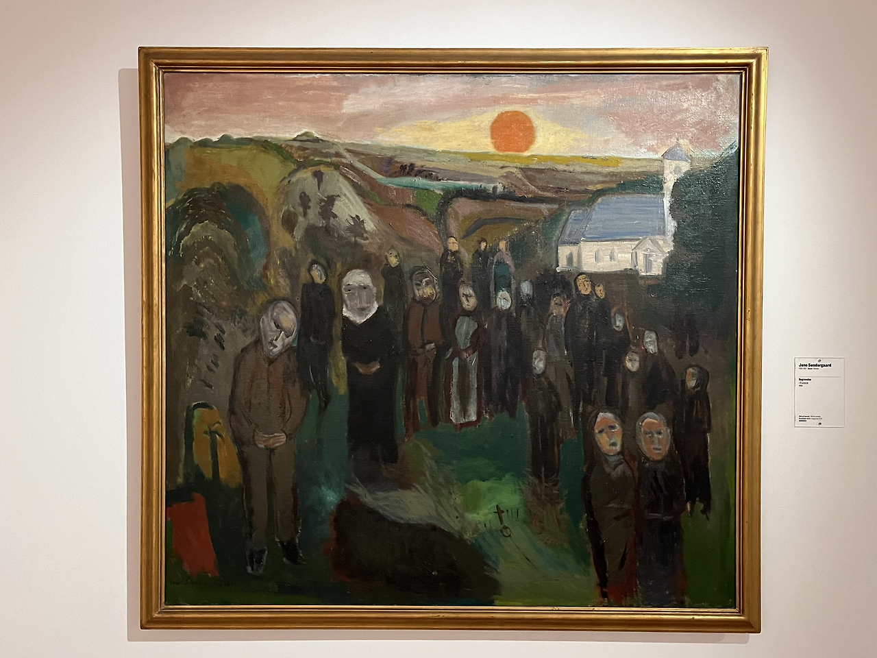 덴마크 현대 그림부터 보고 싶어서 연결된 건너편 건물로 갔다. 원건물을 훼손하지 않고 연결하여 유리천장을 사용하여 증축한 현대적인 건축 감각이 멋지다. 우선 덴마크와 주변국가 작가들의 1900 이후 그림부터 찾아갔다. 첫 번째 들어간 방에는 죽음을 의미하는 그림이 가득했다. 단번에 Edvard Munch 에드바르트 뭉크 (1863-1944, 노르웨이)의 작품임을 알 수 있었으나 찬찬히 보니 전부다 뭉크 그림은 아니다. 무척 흡사하지만 다른 작품들은 Jens Søndergaard 옌스 쇠네르고르 (1895-1957) 덴마크 작가의 그림이다. 뭉크는 어린 나이에 어머니와 한 살 많은 누나를 병으로 잃으며 죽음의 공포와 우울감과 두려움으로 평생을 시달리고 연이은 사랑도 실패하며 정신적으로 치명상을 입게 된다. 세 번째 사랑에서는 여인과의 다툼으로 왼손가락에 총상을 입고 사랑마저도 죽음으로 치달을 수 있다는 사실을 경험하고는 세상과의 소통에도 실패하고 고통스러운 삶과 죽음의 세계를 표현하며, 슬프게도 결과적으로는 오래 살게 된다. 쇠네르고르에 대해 남아있는 기록에서는 심리적으로 죽음의 영향을 받았을 가족관계나 주변인물에 대한 스토리는 찾지 못했지만, 이 두 작가는 정서적으로 많이 닮은 어떤 연결 고리가 있을 거 같다. 뭉크의 첫 번째 그림 <Death Struggle>은 임종을 둘러싼 가족들의 슬픔과 영혼의 안녕을 기도하는 성직자가 기도하는 모습을 보여준다. 그다음 그림으로 발을 옮기면 비슷한 어두운 느낌의 그림으로 Jens Søndergaard 옌스 쇠네르고르의 작품이다. 해가 지는 마을을 뒤로하고 가족과 지인들이 모여서 매장하는 모습을 그린 <Funeral>이다. 등장인물들의 얼굴은 슬픔과 두려움이 가득한 유령처럼 묘사했다. 전쟁과 스페인독감 등의 질병으로 갑작스러운 이별을 해야 하는 사람들의 모습을 지켜보는 작가의 마음을 보여주는 거 같다. 아이러니하게도 이 작품을 보며 작가의 마음을 헤아려보는 21세기의 우리도 이 시대의 전쟁과 질병을 겪으며 같은 모습을 지켜본다. 이 방에 걸려 있는 작품은 나무 한그루 <Winter at Nordstrand 뭉크> 조차도 슬픔을 가득 담고 있다. 아래층의 덴마크 황금기 회화 섹션에서 만난 또 다른 장례식 모습이 기억에 남는다. Anna Ancher의 <A Funeral> (1891)과 또 다른 <A Funeral> (1883), Frants Henningsen의 작품이다. 우연이겠지만 유독 죽음과 장례식을 표현한 그림이 많이 보이고 기억에 남는다.