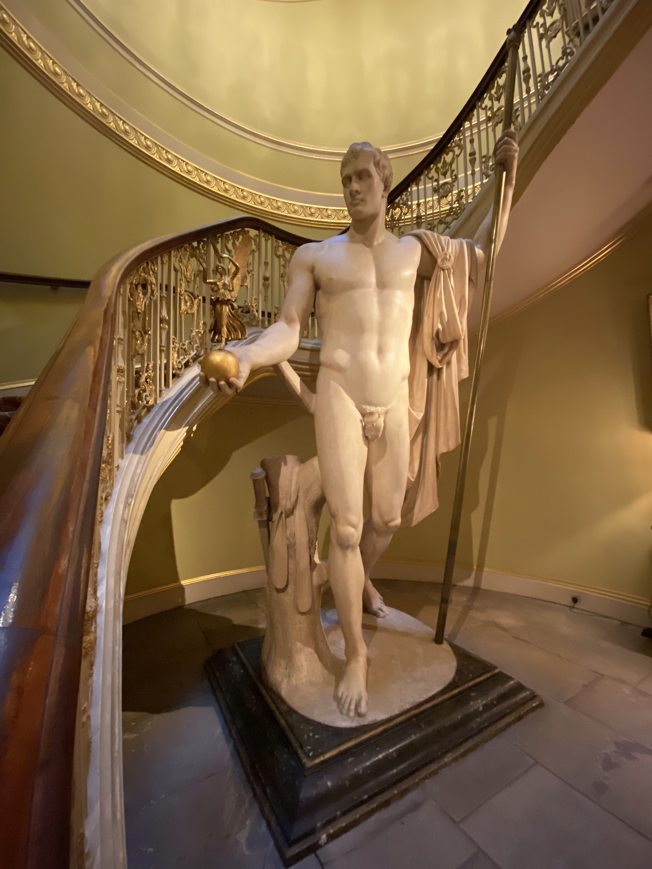 2층으로 올라가는 계단옆에 큰 조각상이 있다. 이 작품은 나폴레옹 전성기인 1806년에 이탈리아 조각가 안토리오 카노바 (1757-1822)에 의해 제작된 나폴레옹의 대리석 조각상이다. 완성된 작품은 1811에 파리에 도착했을 때에 나폴레옹은 프랑스의 황제가 되어 있었다. 이 작품은 루브르 박물관에서 공개되었는데, 그는 이 작품이 썩 마음에 들지 않았나 보다. 나폴레옹이 퇴위된 후인 1816년에 영국정부가 이 조각을 사들이고, 당시 섭정 중이던 훗날의 조지 4세가 웰링턴 공작에게 이 조각상을 선물했다. 웰링턴은 나폴레옹을 존경했고 거절할 이유가 없어서 받아들였다고 한다. 그런데 나는 고개가 좀 갸우뚱 해진다. 나폴레옹의 멋진 전신상을 굳이 웰링턴에게 선물을 해야 했을까?
