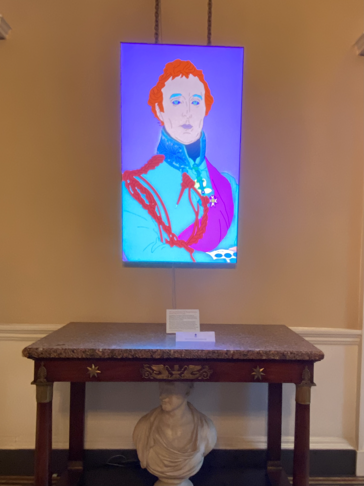 1층에 들어서면 오른쪽에 눈에 뜨이는 디지털 작품이 있으니 내가 좋아하는 작가인 Sir Michael Craig-Martin (1941-)의 작품이다. 1817년 Thomas Lawrence가 그린 웰링턴 장군의 초상화를 디지털로 재해석한 작품으로, 가만히 서서 보고 있으면 크레이그 마틴 특유의 단순한 레이아웃에 강한 파스텔색이 입혀져, 카멜레온처럼 아주 서서히 색상이 바뀌고 있었다. 1분 정도로 세팅되어 있는데 역시나 환상적인 색감이고 이 박물관에서 유일한 현대 작품이다. 작가는 아일랜드 출신이지만 미국과 파리에서 교육을 받았고, 미술뿐만 아니라 영문학과 역사도 공부했다. 1973년부터 런던의 Goldsmiths College에서 미술을 가르쳤고 오랫동안 미술대학의 학장으로 있으면서 영국의 대표 현대화가인 Damian Hirst를 포함한 YBAs (Young British Artists)가 탄생하는데 큰 역할을 했고, 나아가 영국이 현대미술의 주도권을 다시 찾아오는 데에 크게 기여했다. 또한 Tate Gallery의 이사로 있으면서 영국 현대 미술의 위상을 널리 알렸고, Freeze가 설립된 초기에는 앞장서서 예술가들에게 홍보하였다. 화가로서도 영국 현대미술을 대표하는 인기 작가인데, 의외의 장소에서 만나게 되다니 더 반가운 작품이었다.