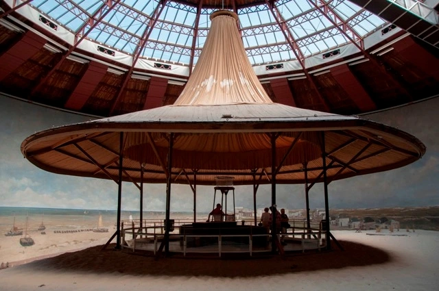 Mesdag 부부는 1880년 벨기에 회사로부터 Scheveningen 마을에서 보는 바다뷰를 파노라마 그림으로 그려달라는 의뢰를 받게 된다. 스헤베닝겐은 헤이그 도심에서 북쪽으로 4km 정도에 위치한 작은 바닷가 마을이다. Mesdag의 부인 Sina (Sientje) Mesdag-van Houten도 화가였기에 함께 작업을 했다. 그는 부인과 제자들의 도움을 받으며 약 1680m² (약 500평) 화폭에 그림을 그려나갔고 약 4개월 만인 1881년에 파노라마 작품을 완성하였다. 360도 파노라마 원형의 지름은 36미터 정도 되는데 원근감 덕분에 바다 멀리까지 보여 훨씬 더 큰 공간감이 느껴진다. 원두막 위 천장의 채광창을 통하여 들어온 빛으로 캔버스 위의 하늘과 구름이 더 자연스러워 보인다. 이젤 앞에 앉아있는 Sina의 모습이 그림 속에 있으니 한번 찾아보자.