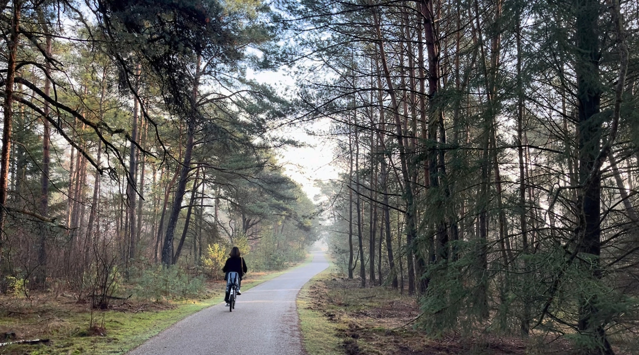 세계정세가 어수선한 1938년에 미술관이 세워지다니, 그것도 국립공원 안에. 더군다나 반고흐 뮤지엄 다음으로 반고흐 작품을 많이 보유하고 있다고 하니 어떤 배경으로 그럴 수 있었는지 너무나 궁금한 곳이었다. 겨울이라 De Hoge Veluwe National Park (호헤 벨루베 국립공원) 입구 매표소 앞은 한적했다. 국립공원 입장료를 내고 지도를 받아서 들어가니 수백 대 이상의 자전거가 질서 있게 정돈되어 있다. 자전거는 바퀴가 크고 브레이크 페달이 없고 모든 자전거의 뒷좌석에는 아이를 태우는 캐리어가 부착되어 있는 것이 굉장히 클래식하다. Kröller-Müller 부부도 그 시절에 이렇게 자전거를 타고 다녔을까. 마침 겨울코트에 모직모자를 쓰고 온지라 1930년대 감성으로 영화의 한 장면처럼 자전거를 타고 있는 내 모습에 스스로 흡족했다. 아침의 안개가 걷히는 중, 쌀쌀하고 촉촉한 공기에 코끝이 살짝 빨개졌지만 참 상쾌했다. 숲 속 길을 지나니 캘리포니아 사막 느낌의 작은 밸리가 나왔다. 이곳은 사슴, 노루, 멧돼지, 늑대, 여우, 담비등 야생동물들도 서식하는 천혜의 자연이 보존되어 있는 곳이다. 갈림길이 두어 번 있었는데 미술관 이정표를 따라서 신나게 달려간다. 파이프를 물고 연기를 뿜으며 자전거를 타는 할아버지와 할머니가 우리를 지나 앞서 나가는데 그들도 영화 속에서 나온 거 같다. 한 15분 정도 사진도 찍고 구경도 하며 슬슬 달려왔더니 나무숲 사이로 나지막한 건물들이 보이고 야외에 조각품들이 하나둘씩 보이기 시작한다. 자전거를 주차장에 세워두고 미술관을 향해 걸어간다. 상상 그 이상의 미술관이 숲 속에 있었다. 왼쪽 사진은 자전거 타는 딸의 뒷모습이고 오른쪽은 우리를 지나가는 노부부 모습이다. 내가 찍었지만 배경이 다 했다.
