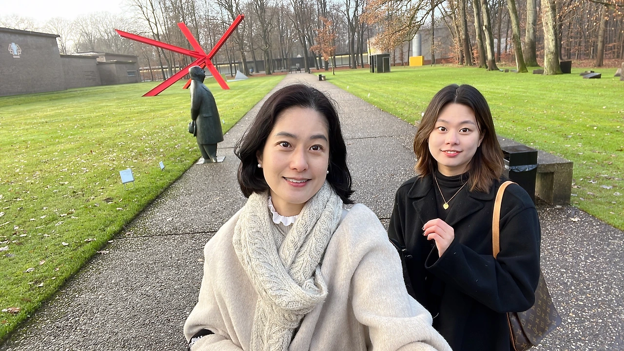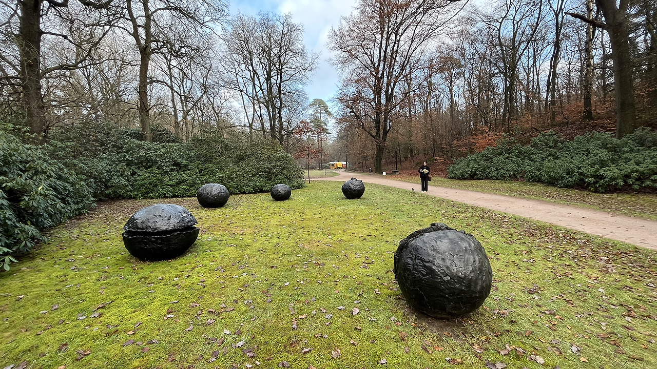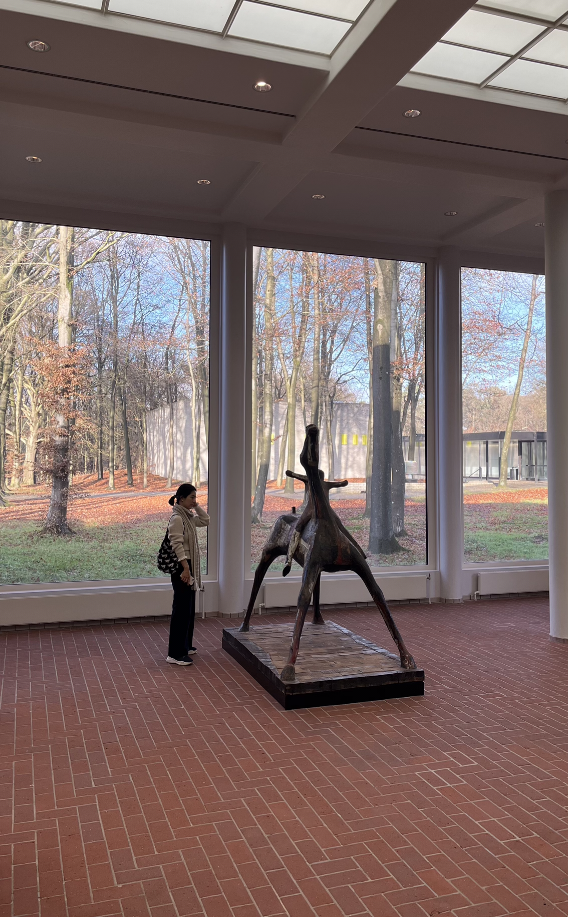 야외의 조각공원은 무려 25 헥타르나 되는 규모이고, 미술관 안내 지도를 보니 산을 넘어가면 작품들이 또 많이 있다고 나와있는데 도대체 정원이 얼마나 넓은 건지 감도 오지 않는다. 욕심내지 않고 기분 좋은 산책을 하며 적당히 둘러보았다. 유명 작가들 작품이 많기도 하고, 작품과 공간이 너무 잘 어울리도록 배치되어 있었다. 겨울이라서 작품이 찬 온도와 습기에 훼손될까 봐 커버를 씌워두기도 했다. 유럽의 잔디는 겨울에도 초록색이고 아직 쌓여있는 낙엽은 진붉은색으로 대비되는 색상이 조화롭고 따뜻하다. 이곳의 겨울은 기온이 낮지는 않지만 비가 많이 오는듯하다. 3시경에 미술관을 나서는데 이미 어둠이 깔리고 있었다. 해가 정말 짧다. 미술관은 5시까지 열려있지만 너무 늦게 나오면 불빛이 별로 없는 공원에서 다시 자전거를 타고 출구를 찾아 나오기가 좀 무서울 거 같다. 혹시라도 멧돼지라도 마주칠까 봐 서둘러 페달을 밟았다. 우리는 공원 앞 마을에서 하룻밤을 더 보내고 다음날 암스테르담으로 향했다. 오래오래 기억에 남을 뮤지엄이다. 기회가 되면 다른 계절에 다시 와서 정원에서 맥주도 마시며 천천히 조각들도 둘러보고 싶다.