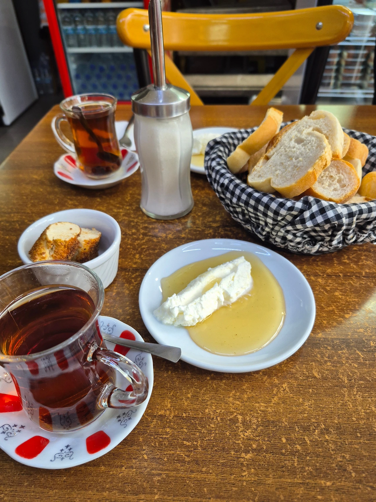 카이막 두 개, 꿀 우유 하나, 차이 두 개 (맨 위의 사진이다)