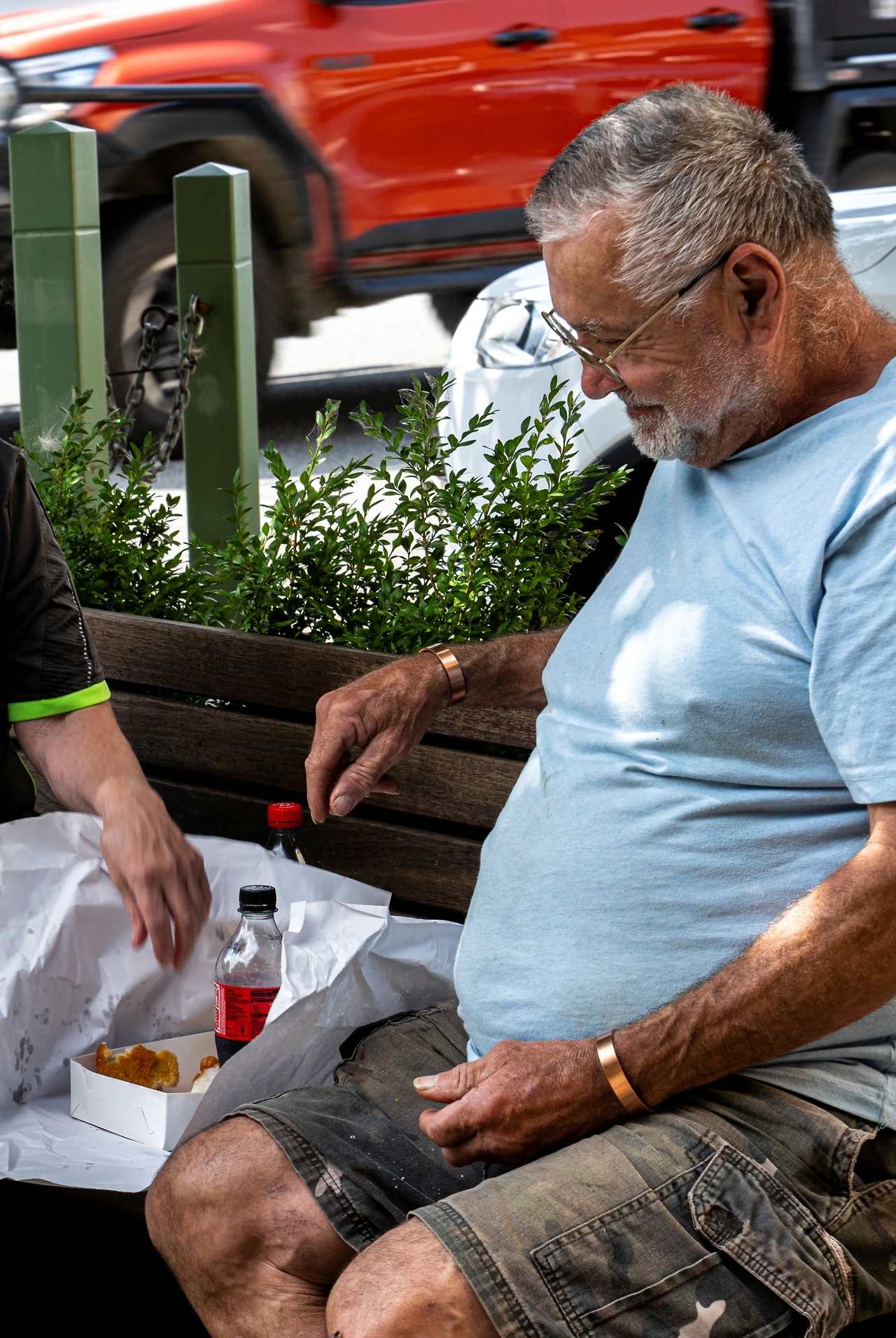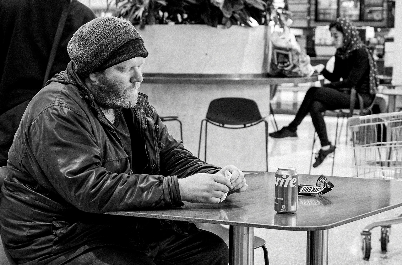무거운 낯빛, 2월 캔버라 날씨에 어울리지 않는 옷차림, 두 손에 꼭 쥔 스낵이 어쩌면 그에게 있어서 오늘하루 섭취하는 곡기의 전부일 것 같은 느낌.