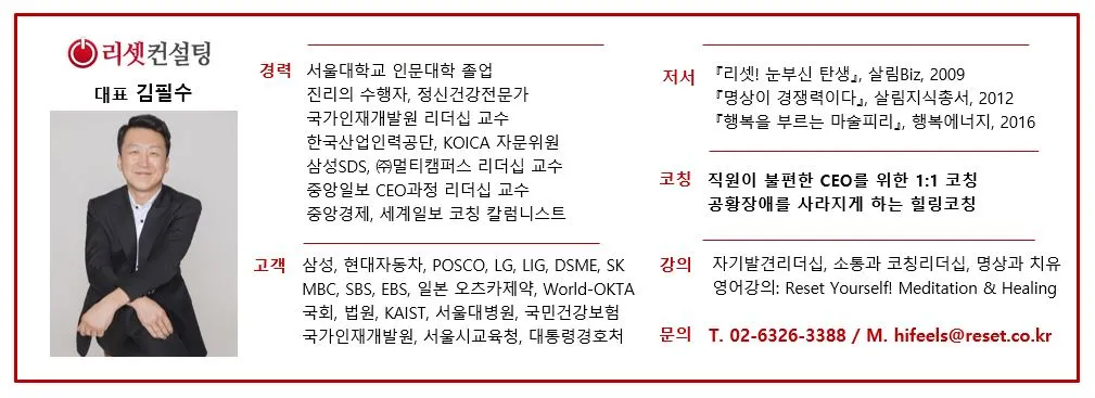 내가 수억 원의 빚, 아내와의 갈등, 끊임없는 신체적 고통에 시달릴 때, 모두들 나를 불쌍하게 보았다. 그리고 나 자신도 가망 없다고 여겼다. 그러나 그 절망의 순간에 만난 코치님께서는 “너는 원래 무한능력의 존재이고 행복 자체다.”라고 선언해 주셨다. 그렇게 전에는 상상도 해본 적이 없는 내 안의 위대한 영웅을 불러내 주셨다.